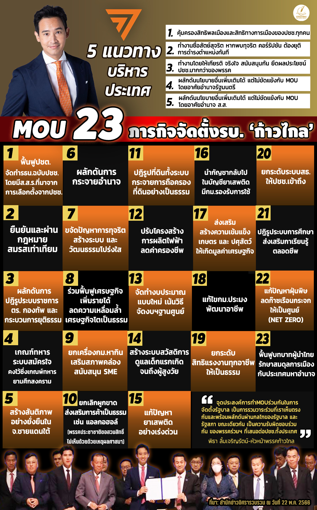 เมื่อวันที่ 22 พ.ค. 2566 เวลา 16.30 น.ที่ห้องบอลลูม โรงแรมคอนราด กทม. แกนนำ 8 พรรคการเมืองเลือกวันครบรอบ 9 ปีรัฐประหารโดย คสช. ร่วมลงนาม MOU เพื่อเตรียมจัดตั้งรัฐบาล นำโดย พรรคก้าวไกล พรรคเพื่อไทย พรรคเสรีรวมไทย พรรคประชาชาติ พรรคไทยสร้างไทย พรรคเป็นธรรม พรรคเพื่อไทรวมพลัง และพรรคพลังสังคมใหม่ รวม 313 เสียง ส.ส.
