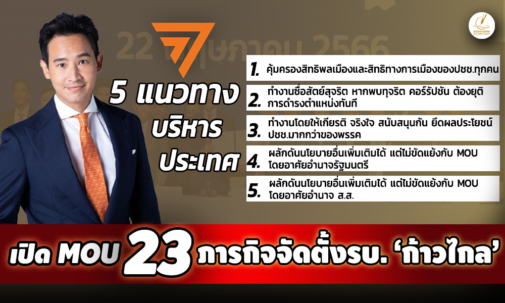“จุดประสงค์ในการทำบันทึกความเข้าใจร่วมกันในการจัดตั้งรัฐบาล เป็นการรวบรวมวาระร่วมที่เราเห็นตรงกัน และพร้อมจะผลักดันผ่านกลไกของรัฐบาล และรัฐสภา ขณะเดียวกันเป็นความรับผิดชอบร่วมกันของพรรคร่วมจัดตั้งรัฐบาลในวันนี้ นี่เป็นจุดประสงค์ เมื่อรวมวาระ ความตั้งใจ การผลักดัน ความรับผิดชอบที่เสนอประชาชนคนไทยทั้งประเทศ” นายพิธา กล่าว