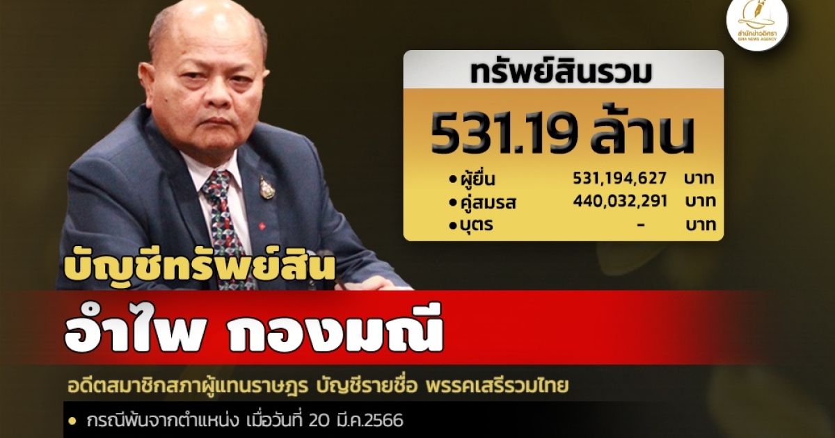 สำนักงานคณะกรรมการป้องกันและปราบปรามการทุจริตแห่งชาติ (ป.ป.ช.) เปิดเผยบัญชีแสดงทรัพย์สินและหนี้สินของ นายอำไพ กองมณี อดีตส.ส.บัญชีรายชื่อ พรรคเสรีรวมไทย โดยแจ้งมีทรัพย์สินกว่า 531.19 ล.ประกอบด้วยเงินฝาก 42 บัญชี มูลค่ารวม 39.05 ล. ที่ดิน 150 แปลง มูลค่ารวม 349.32 ล. ทรัพย์สินที่น่าสนใจมี ทองคำแท่ง น้ำหนักรวม 130 บาท หลวงพ่อคง วัดบางกะพ้อม, หลวงพ่อคงลงยา วัดป่าชำงาม, หลวงพ่อทวด วัดช้างไห้ปี2515 และเครื่องประดับ หลายรายการ