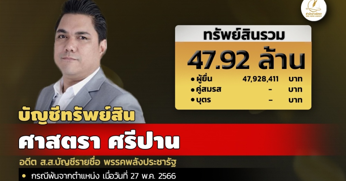 สำนักงานคณะกรรมการป้องกันและปราบปรามการทุจริตแห่งชาติ (ป.ป.ช.) เปิดเผยบัญชีแสดงทรัพย์สินและหนี้สินของ นาย ศาสตรา ศรีปาน อดีต ส.ส.บัญชีรายชื่อ พลังประชารัฐ โดยแจ้งมี ทรัพย์สิน 47.92 ล. ประกอบด้วย เงินสด มูลค่ารวม 4.2 ล. ที่ดิน 6 แปลง มูลค่า 32.30 ล. บ้าน 2 หลัง และโรงเรียน 1 หลัง มูลค่ารวม 7.22 ล้านบาท และแจ้งมีรายได้ต่อปี 4.91 ล. จากเงินเดือน,รายได้จากโรงเรียน,ทุนคืนประกันรถยนต์และขายพระเครื่อง