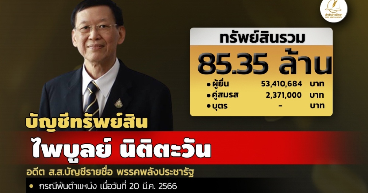 สำนักงานคณะกรรมการป้องกันและปราบปรามการทุจริตแห่งชาติ (ป.ป.ช.) เปิดเผยบัญชีแสดงทรัพย์สินและหนี้สินของ ไพบูลย์ นิติตะวัน อดีต ส.ส.บัญชีรายชื่อ พรรคพลังประชารัฐ โดยแจ้งมี ทรัพย์สิน 85.35 ล. ประกอบด้วย เงินฝาก 9 บัญชี มูลค่ารวม 2.02 ล้านบาท เงินให้กู้ยืม 79.51 ล้านบาท ระบุชื่อผู้กู้ บจก.สกายแลนด์ พร็อพเพอร์ตี้ และแจ้งมีรายได้ต่อปี 1.31 ล้านบาท จาก เงินเดือนและเบี้ยประชุม