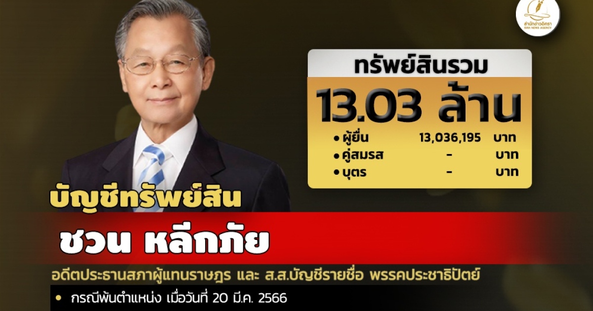 สำนักงานคณะกรรมการป้องกันและปราบปรามการทุจริตแห่งชาติ (ป.ป.ช.) เปิดเผยบัญชีแสดงทรัพย์สินและหนี้สินของ นาย ชวน หลีกภัย อดีต ประธานสภาผู้แทนราษฎร และ ส.ส.บัญชีรายชื่อ พรรคประชาธิปัตย์ โดยแจ้งมี ทรัพย์สิน 13.03 ล. ประกอบด้วย เงินฝาก 6 บัญชี มูลค่ารวม 10.34ล้านบาท ที่ดิน 1 แปลง มูลค่า 1.20 ล้านบาท นาฬิกาข้อมือ 19 เรือน สร้อยคอทองคำ 5 เส้น เครื่องดนตรีแซกโซโฟน 3 ตัว และแจ้งมีรายได้ต่อปี 2.21 ล้านบาท จาก เงินบำนาญ,เงินเดือนประธานสภา และเงินกองทุนเพื่อผู้เคยเป็นสมาชิกสภา