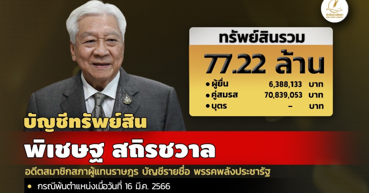 สำนักงานคณะกรรมการป้องกันและปราบปรามการทุจริตแห่งชาติ (ป.ป.ช.) เปิดเผยบัญชีแสดงทรัพย์สินและหนี้สินของ นาย พิเชษฐ สถิรชวาล อดีต ส.ส.บัญชีรายชื่อ พรรคพลังประชารัฐ โดยแจ้งมี ทรัพย์สิน 77.22 ล. ประกอบด้วย เงินฝาก 5 บัญชี มูลค่า 11.69 ล. ที่ดิน 36 แปลง มูลค่ารวม 43.50 ล. ตึกแถว 2 หลัง และบ้าน 1 หลัง มูลค่ารวม 6.30 ล้านบาท และแจ้งมีรายได้ต่อปี 1.36 ล. จาก เงินเดือนเบี้ยประชุมและดอกเบี้ย
