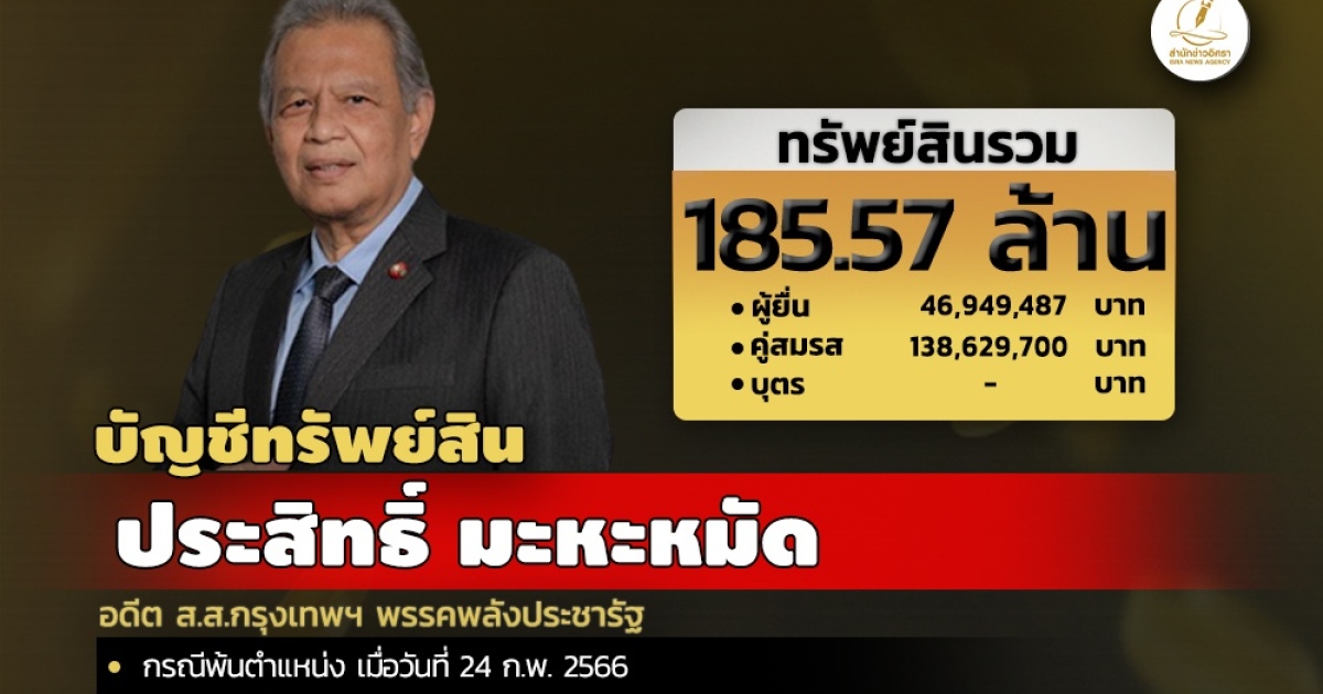 สำนักงานคณะกรรมการป้องกันและปราบปรามการทุจริตแห่งชาติ (ป.ป.ช.) เปิดเผยบัญชีแสดงทรัพย์สินและหนี้สินของ นาย ประสิทธิ์ มะหะหมัด อดีต ส.ส.กรุงเทพฯ พรรคพลังประชารัฐ โดยแจ้งมี ทรัพย์สิน 185.57 ล. ประกอบด้วย เงินสด มูลค่ารวม 8 แสนบาท เงินฝาก 8 บัญชี มูลค่ารวม 6.58 ล้านบาท ที่ดิน 35 แปลง มูลค่ารวม 130.23 ล้านบาท อาทิ ที่ดินใน กรุงเทพฯ,สมุทรปราการ ทรัพย์สินที่น่าสนใจมี สร้อยคออัญมณี 9 เส้น แหวนอัญมณี 35 วง จี้อัญมณี 20 อัน และเครื่องประดับหลายรายการ