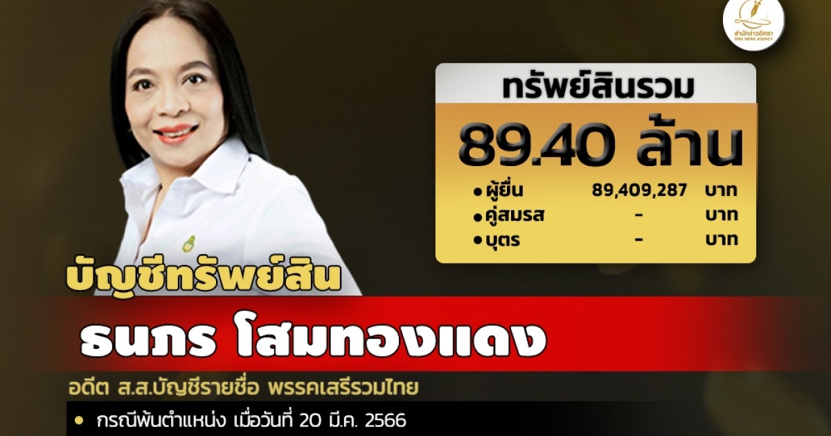 สำนักงานคณะกรรมการป้องกันและปราบปรามการทุจริตแห่งชาติ (ป.ป.ช.) เปิดเผยบัญชีแสดงทรัพย์สินและหนี้สินของ นางสาว ธนภร โสมทองแดง อดีต ส.ส.บัญชีรายชื่อ พรรคเสรีรวมไทย โดยแจ้งมี ทรัพย์สิน 89.40 ล. ประกอบด้วย เงินสด มูลค่า 3 แสนบาท เงินลงทุน มูลค่า 4.05 ล้านบาท ที่ดิน 4 แปลง มูลค่ารวม 79 ล้านบาท บ้านเดี่ยว 1 หลัง มูลค่า 4 ล้านบาท และแจ้งมีรายได้ต่อปี 1.93 ล้านบาท จาก เงินเดือน,เบี้ยประชุม,ขายรถยนต์, ขายทองคำรูปพรรณ,ขายต่างหู