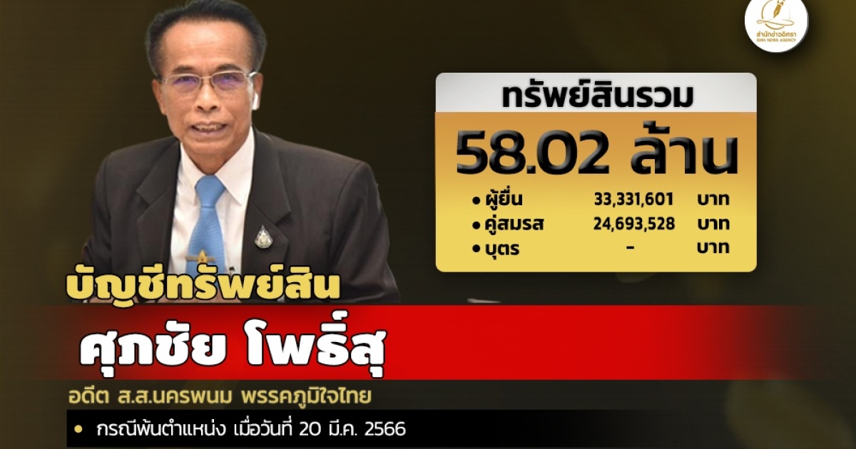 สำนักงานคณะกรรมการป้องกันและปราบปรามการทุจริตแห่งชาติ (ป.ป.ช.) เปิดเผยบัญชีแสดงทรัพย์สินและหนี้สินของ นาย ศุภชัย โพธิ์สุ อดีต ส.ส.นครพนม พรรคภูมิใจไทย โดยแจ้งมี ทรัพย์สิน 58.02 ล. ประกอบด้วย เงินฝาก 7 บัญชี มูลค่ารวม 1.03 ล. ที่ดิน 79 แปลง มูลค่ารวม 28.90 ล. โรงเรือนและสิ่งปลูกสร้าง 9 หลัง มูลค่ารวม 18.70 ล. และ แจ้งมีรายได้ต่อปี 5.21 ล้านบาท จาก เงินเดือน,เบี้ยประชุม,ขายทรัพย์สินอื่น, ค่าเช่าตลาด,ขายรถยนต์นั่งส่วนบุคคลเกิน 7 คน และ ขายรถยนต์นั่งส่วนบุคคลไม่เกิน 7 คน
