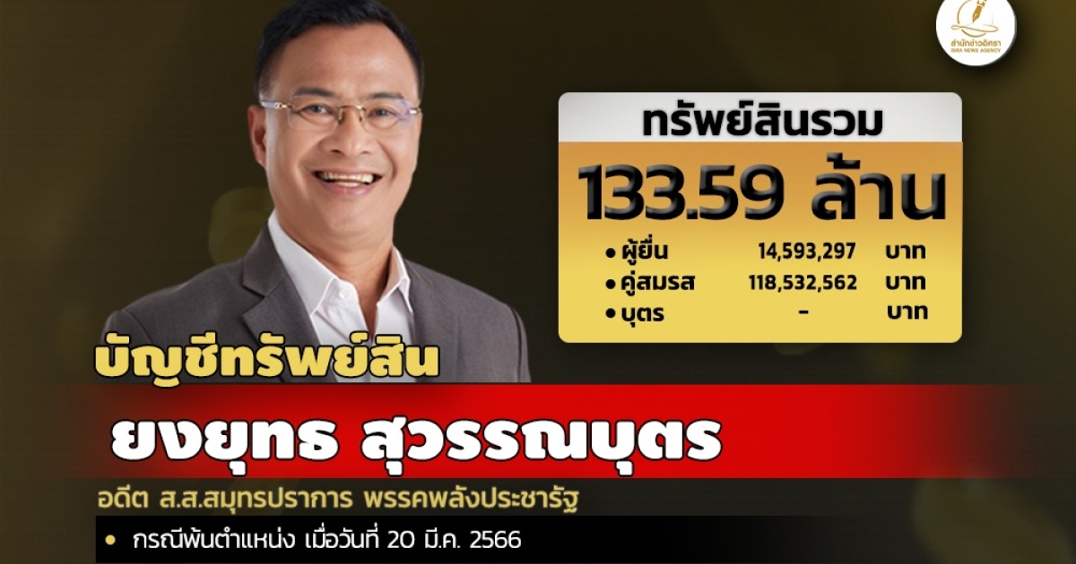 สำนักงานคณะกรรมการป้องกันและปราบปรามการทุจริตแห่งชาติ (ป.ป.ช.) เปิดเผยบัญชีแสดงทรัพย์สินและหนี้สินของ นาย ยงยุทธ สุวรรณบุตร อดีต ส.ส.สมุทรปราการ พรรคพลังประชารัฐ โดยแจ้งมี ทรัพย์สิน 133.59 ล. ประกอบด้วย งินฝาก 25 บัญชี มูลค่ารวม 7.67 ล. ที่ดิน 3 แปลง มูลค่ารวม 2.19 ล. โรงเรือนและสิ่งปลูกสร้าง 5 หลัง มูลค่ารวม 12.12 ล. ทรัพย์สินที่น่าสนใจ กระเป๋าแบรนด์เนม 7 ใบ นาฬิกา 3 เรือน เครื่องประดับ หลายรายการ