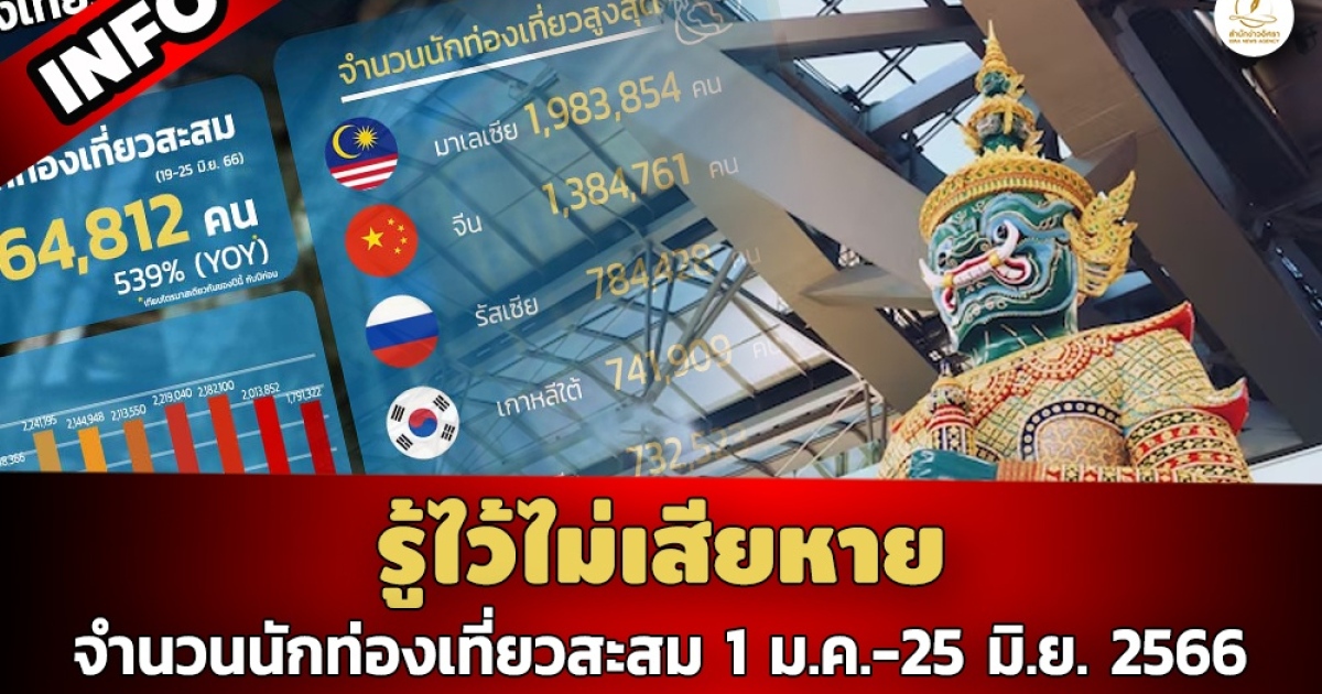 กองเศรษฐกิจการท่องเที่ยวและกีฬา รายงานข้อมูลล่าสุด ณ วันที่ 26 มิ.ย. 66 ว่าประเทศไทยมีนักท่องเที่ยวต่างชาติตลอดทั้งสัปดาห์ (19-25 มิ.ย. 66) มีจำนวนทั้งสิ้น 523,794 คน คิดเป็นนักท่องเที่ยวต่างชาติที่เดินทางเข้าไทยเฉลี่ยวันละ 74,828 คน ทำให้จำนวนนักท่องเที่ยวสะสมตั้งแต่วันที่ 2 ม.ค. 66 ที่ผ่านมา ทั้งหมด 12,464,812 คน สร้างรายได้จากนักท่องเที่ยวต่างชาติแล้ว 514,237 ล้านบาท