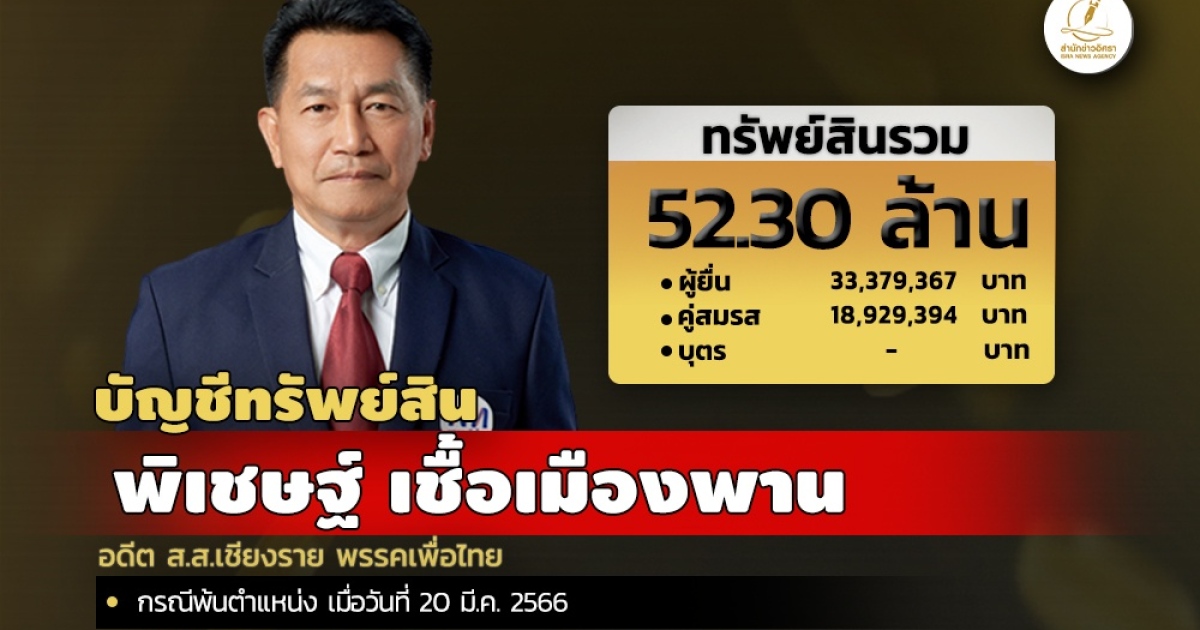 สำนักงานคณะกรรมการป้องกันและปราบปรามการทุจริตแห่งชาติ (ป.ป.ช.) เปิดเผยบัญชีแสดงทรัพย์สินและหนี้สินของ นายพิเชษฐ์ เชื้อเมืองพาน อดีต ส.ส.เชียงราย พรรคเพื่อไทย (เป็นรองประธานสภาฯ คนที่ 2 จากพรรคเพื่อไทย ในสภาผู้แทนราษฎร ชุดที่ 26) โดยแจ้งมี ทรัพย์สิน 52.30 ล. ประกอบด้วย เงินฝาก 6 บัญชี มูลค่ารวม 3.02 ล. ที่ดิน 20 แปลง มูลค่ารวม 28.24 ล. โรงเรือนและสิ่งปลูกสร้าง จำนวน 7 หลัง มูลค่ารวม 8.50 ล. และแจ้งมีรายได้ต่อปี 5.26 ล. จาก เงินเดือน ค่าตอบแทน, ขายที่ดิน ฉ.64410 ปทุมธานี
