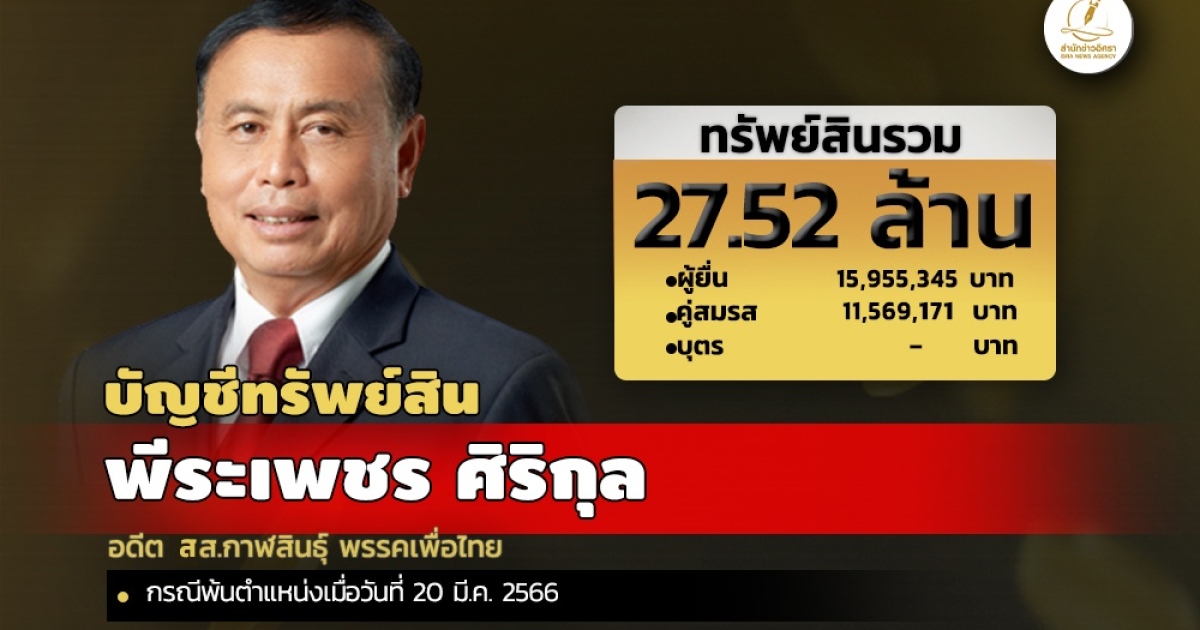 สำนักงานคณะกรรมการป้องกันและปราบปรามการทุจริตแห่งชาติ (ป.ป.ช.) เปิดเผยบัญชีแสดงทรัพย์สินและหนี้สินของ นายพีระเพชร ศิริกุล อดีต สส.กาฬสินธุ์ พรรคเพื่อไทย โดยแจ้งมี ทรัพย์สิน 27.52 ล. ประกอบด้วย เงินฝาก 24 บัญชี มูลค่ารวม 6.40 ล้านบาท ที่ดิน 30 แปลง มูลค่ารวม 14.61 ล้านบาท บ้านพัก 2 ชั้น 1 หลัง บ้านพักตึก 3 ชั้น 2 หลัง มูลค่ารวม 4.20 ล้านบาท ผู้ยื่นแจ้งมีรายได้ต่อปี 1.56 ล้านบาท จาก เงินเดือน