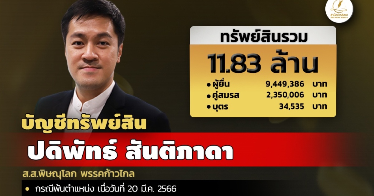 สำนักงานคณะกรรมการป้องกันและปราบปรามการทุจริตแห่งชาติ (ป.ป.ช.) เปิดเผยบัญชีแสดงทรัพย์สินและหนี้สินของ นายปดิพัทธ์ สันติภาดา ส.ส.พิษณุโลก พรรคก้าวไกล (เป็นรองประธานสภาฯ คนที่ 1 ในสภาผู้แทนราษฎร ชุดที่ 26) โดยแจ้งมี ทรัพย์สิน 11.83 ล. ประกอบด้วย เงินสด มูลค่า 1.42 แสนบาท เงินฝาก 15 บัญชี มูลค่ารวม 1.87 แสนบาท ห้องชุดและตึกแถว 3 ชั้นครึ่ง อย่างละ 1 รายการ มูลค่ารวม 8.69 ล. และแจ้งมีรายได้ต่อปี 1.43 ล. จาก เงินเดือน และเบี้ยประชุม กมธ/อนุ