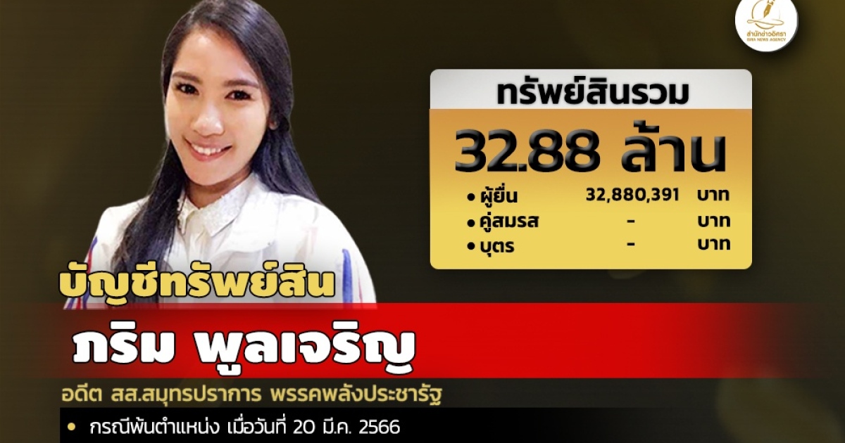 สำนักงานคณะกรรมการป้องกันและปราบปรามการทุจริตแห่งชาติ (ป.ป.ช.) เปิดเผยบัญชีแสดงทรัพย์สินและหนี้สินของ นางสาวภริม พูลเจริญ อดีต สส.สมุทรปราการ พรรคพลังประชารัฐ ทรัพย์สิน 32.88 ล. ประกอบด้วย เงินฝาก 8 บัญชี มูลค่ารวม 4.49 ล้านบาท ที่ดิน 2 แปลง มูลค่ารวม 3 ล้านบาท โรงเรือนและสิ่งปลูกสร้าง 1 รายการ มูลค่า 10 ล้านบาท ทรัพย์สินที่น่าสนใจ ม้า 1 ตัว ทองคำ 50 บาท มูลค่ารวม 2.79 ล้านบาท