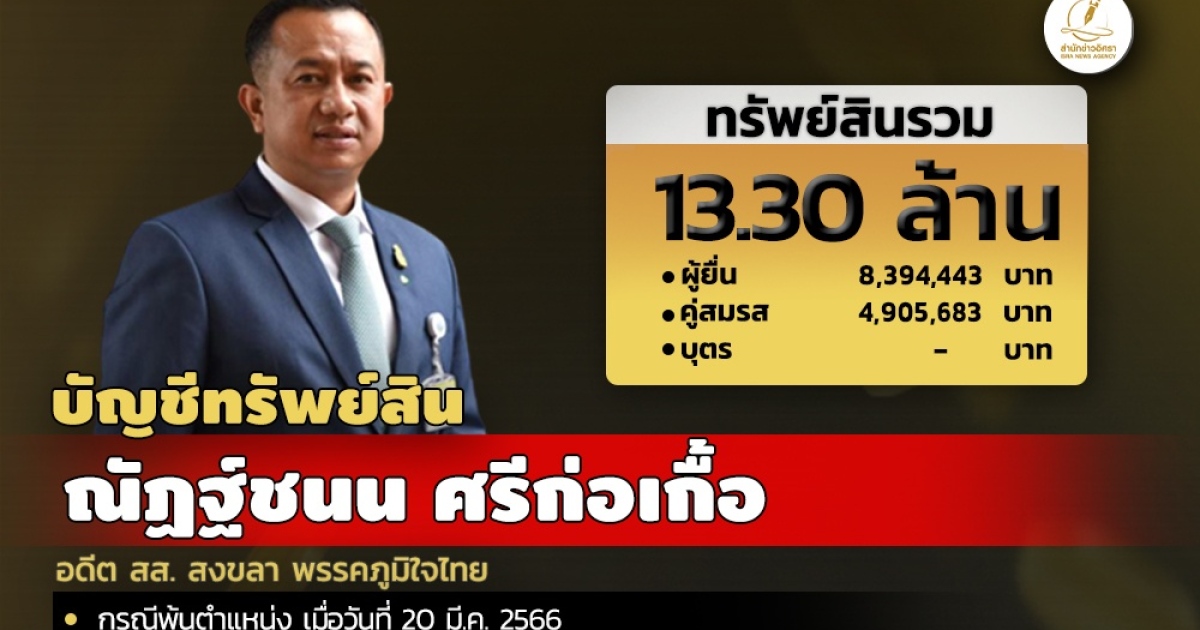 สำนักงานคณะกรรมการป้องกันและปราบปรามการทุจริตแห่งชาติ (ป.ป.ช.) เปิดเผยบัญชีแสดงทรัพย์สินและหนี้สินของ นายณัฏฐ์ชนน ศรีก่อเกื้อ อดีต สส. สงขลา พรรคภูมิใจไทย โดยแจ้งมี ทรัพย์สิน 13.30 ล. ประกอบด้วย เงินฝาก 8 บัญชี มูลค่ารวม 3.57 ล. ที่ดิน 4 แปลง มูลค่ารวม 1.06 ล. รถเก๋ง 4 ประตู 2 คัน มูลค่ารวม 4.20 ล. และแจ้งมีรายได้ต่อปี 1.36 บาท จาก เงินเดือน และเงินเพิ่ม สส.