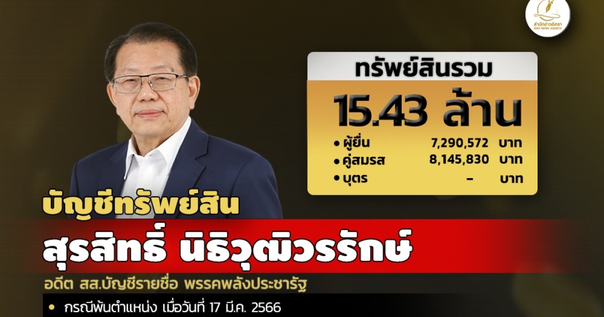 สำนักงานคณะกรรมการป้องกันและปราบปรามการทุจริตแห่งชาติ (ป.ป.ช.) เปิดเผยบัญชีแสดงทรัพย์สินและหนี้สินของ นายสุรสิทธิ์ นิธิวุฒิวรรักษ์ อดีต ส.ส.บัญชีรายชื่อ พรรคพลังประชารัฐ ทรัพย์สิน 15.43 ล. ประกอบด้วย เงินฝาก 7 บัญชี มูลค่ารวม 3.40 แสนบาท ที่ดิน 8 แปลง มูลค่ารวม 6.61 ล. บ้านเดี่ยว 1 หลัง ห้องชุด 1 รายการ มูลค่ารวม 3.60 ล. และแจ้งมีรายได้ต่อปี 1.78 ล. จาก ค่าตอบแทนตำแหน่ง และ ที่ปรึกษากฎหมาย
