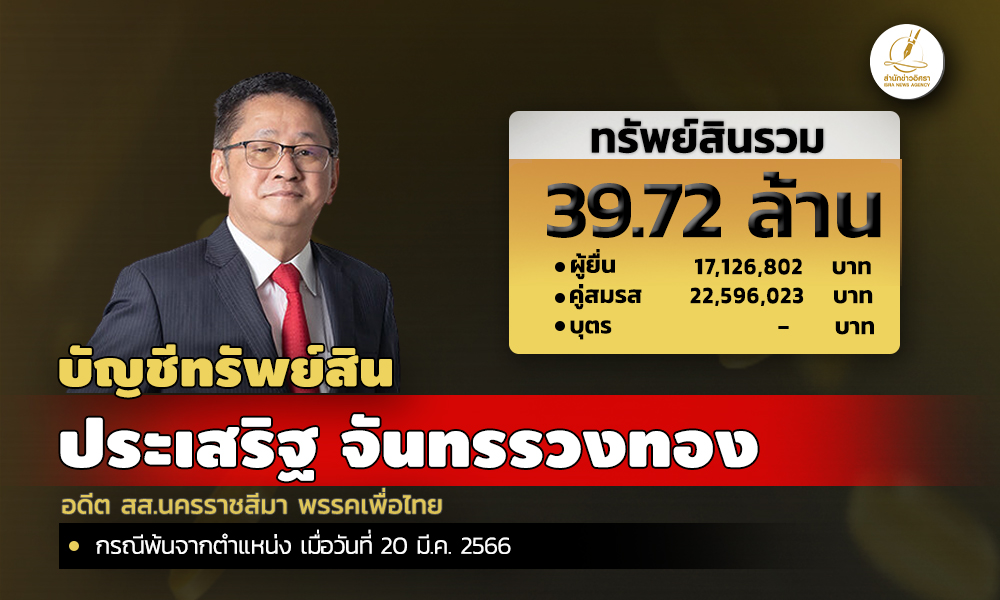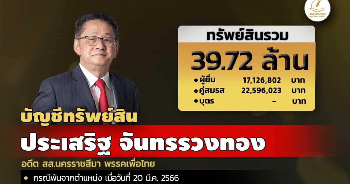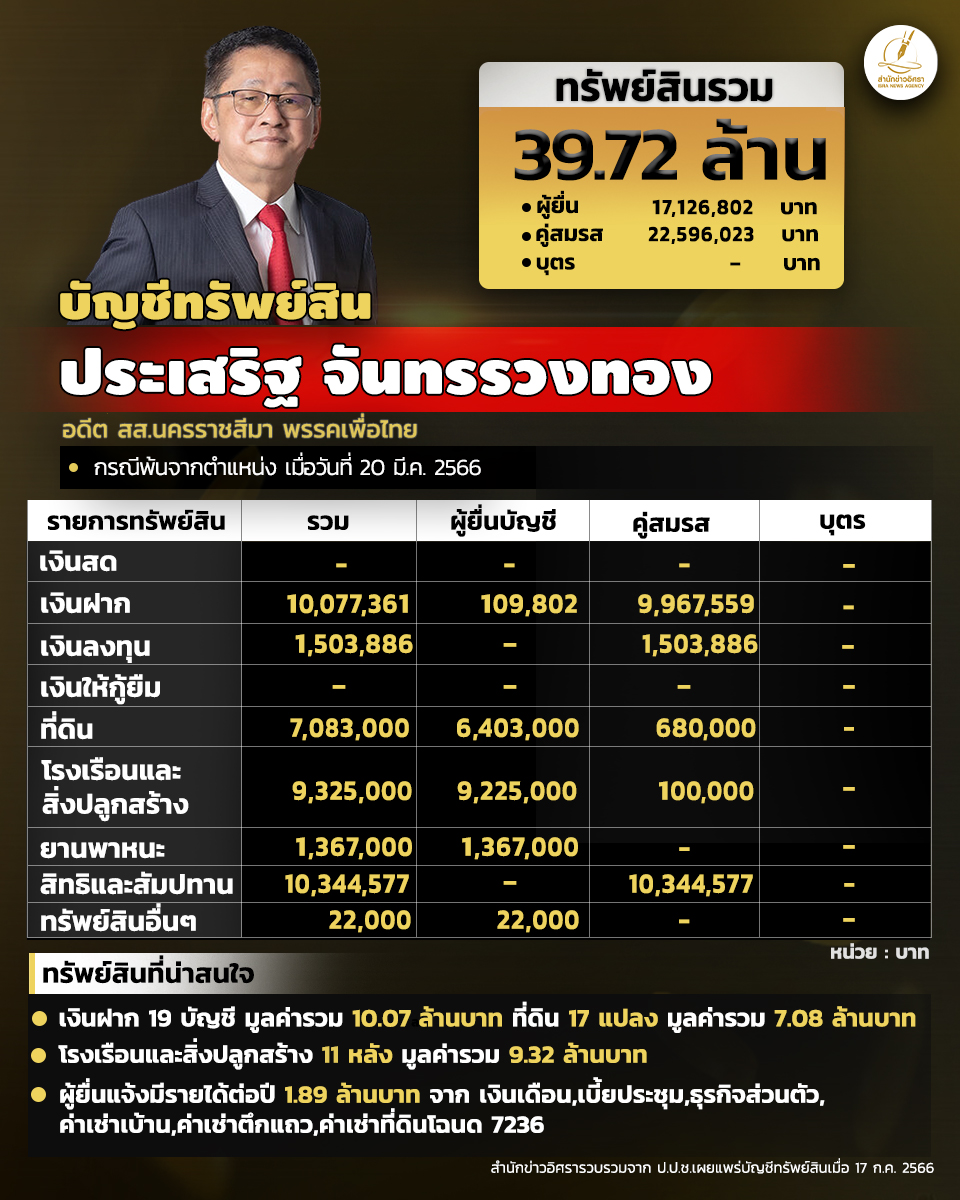 สำนักงานคณะกรรมการป้องกันและปราบปรามการทุจริตแห่งชาติ (ป.ป.ช.) เปิดเผยบัญชีแสดงทรัพย์สินและหนี้สินของ นายประเสริฐ จันทรรวงทอง อดีต สส.นครราชสีมา พรรคเพื่อไทย ทรัพย์สิน 39.72 ล. ประกอบด้วย เงินฝาก 19 บัญชี มูลค่ารวม 10.07ล. ที่ดิน 17 แปลง มูลค่ารวม 7.08 ล. โรงเรือนและสิ่งปลูกสร้าง 11 หลัง มูลค่ารวม 9.32 ล. ผู้ยื่นแจ้งมีรายได้ต่อปี 1.89 ล. จาก เงินเดือน,เบี้ยประชุม,ธุรกิจส่วนตัว, ค่าเช่าเบ้าน,ค่าเช่าตึกแถว,ค่าเช่าที่ดินโฉนด 7236