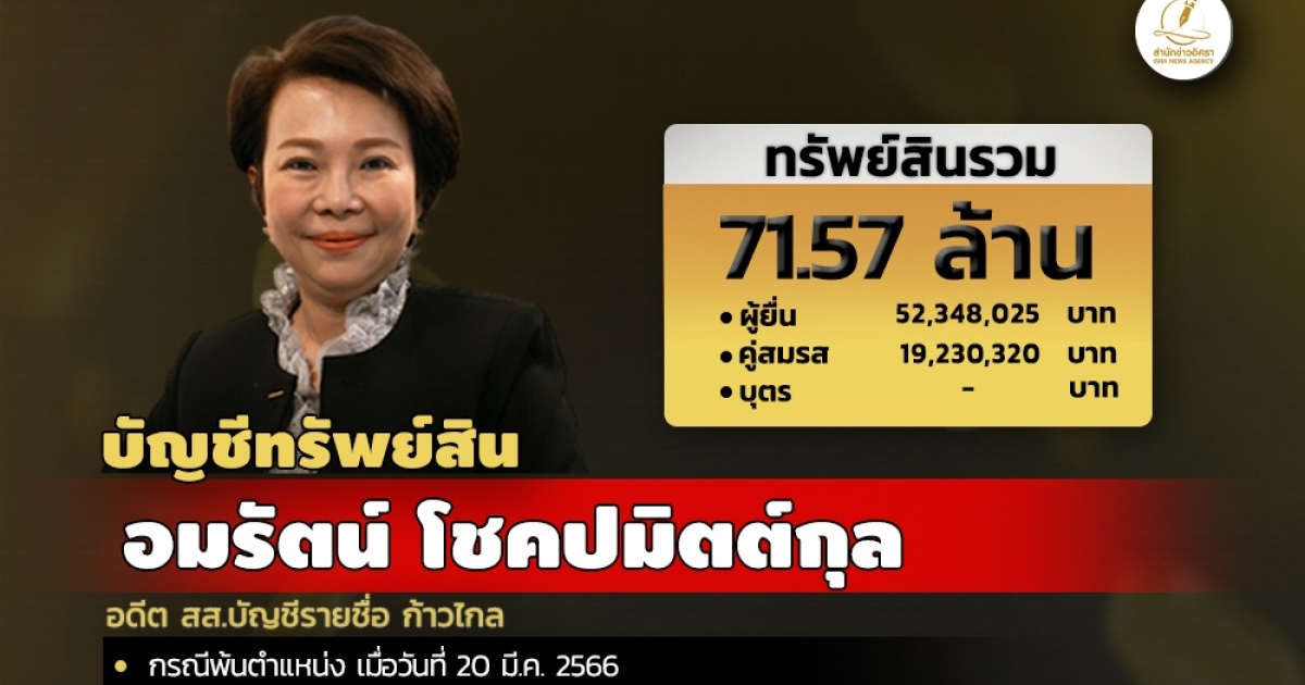 สำนักงานคณะกรรมการป้องกันและปราบปรามการทุจริตแห่งชาติ (ป.ป.ช.) เปิดเผยบัญชีแสดงทรัพย์สินและหนี้สินของ นางอมรัตน์ โชคปมิตต์กุล อดีต สส.บัญชีรายชื่อ ก้าวไกล ทรัพย์สิน 71.57 ล. ประกอบด้วย เงินสด มูลค่า 5 แสนบาท เงินฝาก 15 บัญชี มูลค่ารวม 3.19 ล. โรงเรือนและสิ่งปลูกสร้าง 11 รายการ มูลค่า 40.05 ล. และแจ้งมีรายได้ต่อปี 5 ล. จาก เงินเดือนและค่าตอบแทน, เบี้ยประชุม,การให้เช่าทรัพย์สิน และ การประกอบวิชาชีพอิสระ