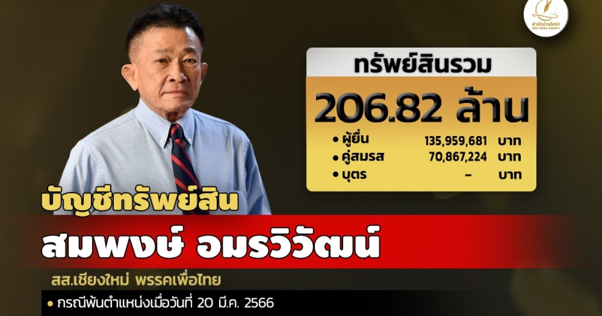 สำนักงานคณะกรรมการป้องกันและปราบปรามการทุจริตแห่งชาติ (ป.ป.ช.) เปิดเผยบัญชีแสดงทรัพย์สินและหนี้สินของ นายสมพงษ์ อมรวิวัฒน์ สส.เชียงใหม่ พรรคเพื่อไทย ในสมัยรัฐบาล พล.อ.ประยุทธ์ จันทร์โอชา ทรัพย์สิน 206.82 ล. ประกอบด้วย เงินฝาก 12 บัญชี มูลค่ารวม 8.93 ล. ที่ดิน 47 แปลง มูลค่ารวม 98.12 ล. โรงเรือนและสิ่งปลูกสร้าง 2 รายการ มูลค่ารวม 15 ล. และแจ้งมีรายได้ต่อปี 15.03 ล. จาก เงินเดือน,เงินเพิ่ม สส.,ขายที่ดิน, เงินปันผลและดอกเบี้ยจากหุ้นกู้ใน ตลท.