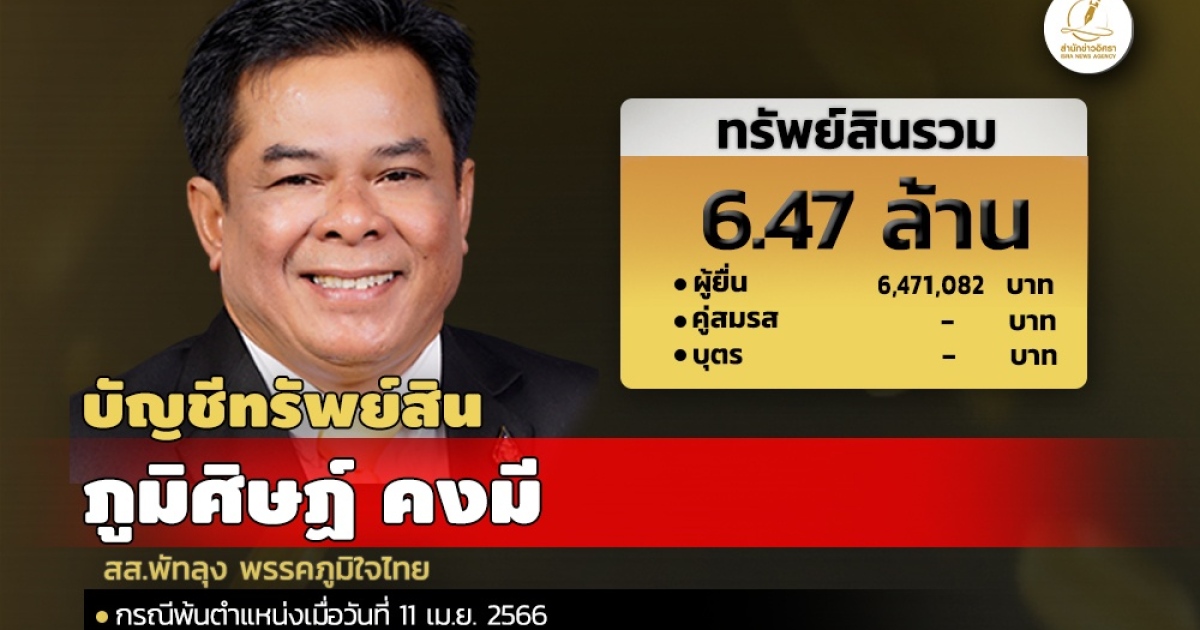 สำนักงานคณะกรรมการป้องกันและปราบปรามการทุจริตแห่งชาติ (ป.ป.ช.) เปิดเผยบัญชีแสดงทรัพย์สินและหนี้สินของ นายภูมิศิษฏ์ คงมี สส.พัทลุง พรรคภูมิใจไทย ทรัพย์สิน 6.47 ล. ประกอบด้วย เงินสด มูลค่า 42,000 บาท เงินฝาก 3 บัญชี มูลค่ารวม 2.04 แสนบาท ที่ดิน 2 แปลง มูลค่ารวม 7 แสนบาท บ้านเดี่ยว 1 หลัง มูลค่า 5 ล. และแจ้งมีรายได้ต่อปี 1.63 ล. จาก เงินเดือน และรับเงินทำบุญจากงานศพมารดา