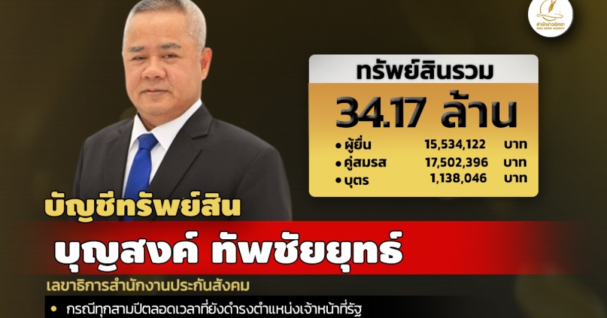 สำนักงานคณะกรรมการป้องกันและปราบปรามการทุจริตแห่งชาติ (ป.ป.ช.) เปิดเผยบัญชีแสดงทรัพย์สินและหนี้สินของ นายบุญสงค์ ทัพชัยยุทธ์ เลขาธิการสำนักงานประกันสังคม ทรัพย์สิน 34.17 ล. ประกอบด้วย เงินฝาก 15 บัญชี มูลค่ารวม 8.08 ล. ที่ดิน 4 แปลง มูลค่ารวม 5.33 ล. โรงเรือนและสิ่งปลูกสร้าง 1 รายการ มูลค่ารวม 12.54 ล. และแจ้งมีรายได้ต่อปี 2.18 ล. จาก เงินเดือน,ค่าเบี้ยประชุม และค่าตอบแทนวิทยากร