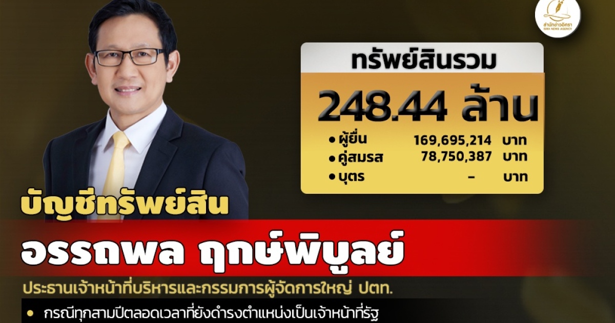 สำนักงานคณะกรรมการป้องกันและปราบปรามการทุจริตแห่งชาติ (ป.ป.ช.) เปิดเผยบัญชีแสดงทรัพย์สินและหนี้สินของ นายอรรถพล ฤกษ์พิบูลย์ ประธานเจ้าหน้าที่บริหารและกรรมการผู้จัดการใหญ่ ปตท. ทรัพย์สิน 248.44 ล. ประกอบด้วย เงินฝาก 16 บัญชี มูลค่ารวม 81.54 ล. ที่ดิน 3 แปลง มูลค่ารวม 9.43 ล.โรงเรือนและสิ่งปลูกสร้าง 7 รายการ 25.42 ล้านบาท และแจ้งมีรายได้ต่อปี 49 ล. จาก ค่าจ้าง,โบนัส,เบี้ยประชุม/ ค่าตอบแทนกรรมการ,ค่าเช่า,ดอกเบี้ยและเงินปันผล