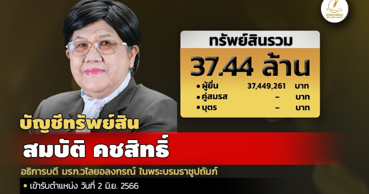 สำนักงานคณะกรรมการป้องกันและปราบปรามการทุจริตแห่งชาติ (ป.ป.ช.) เปิดเผยบัญชีแสดงทรัพย์สินและหนี้สินของ นางสมบัติ คชสิทธิ์ อธิการบดี มรภ.วไลยอลงกรณ์ ในพระบรมราชูปถัมภ์ ทรัพย์สิน 37.44 ล. ประกอบด้วย เงินฝาก 7 บัญชี มูลค่ารวม 2.44 ล. ที่ดิน 4 แปลง มูลค่ารวม 9.58 ล. โรงเรือนและสิ่งปลูกสร้าง 2 รายการ มูลค่ารวม 7 ล. และแจ้งมีรายได้ต่อปี 1.40 ล. จาก ค่าจ้าง บำนาญ ฯลฯ