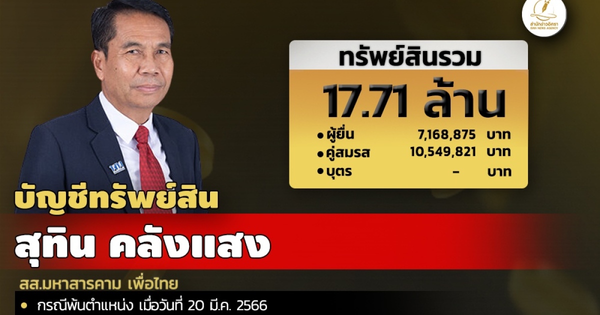 สำนักงานคณะกรรมการป้องกันและปราบปรามการทุจริตแห่งชาติ (ป.ป.ช.) เปิดเผยบัญชีแสดงทรัพย์สินและหนี้สินของ นายสุทิน คลังแสง สส.มหาสารคาม เพื่อไทย ทรัพย์สิน 17.71 ล. ประกอบด้วย เงินฝาก 10 บัญชี มูลค่ารวม 6.25 หมื่นบาท ที่ดิน 13 แปลง มูลค่ารวม 12.15 ล. โรงเรือนและสิ่งปลูกสร้าง 6 รายการ มูลค่ารวม 4.15 ล. ผู้ยื่นแจ้งมีรายได้ต่อปี 2.11 ล. จาก เงินเดือน และเงินเดือนผู้เชี่ยวชาญ