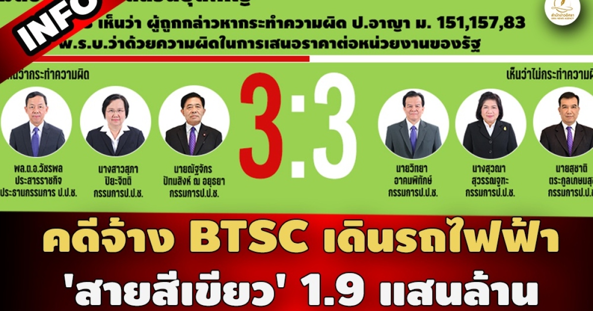 เมื่อวันที่ 12 ก.ย.2566 คณะกรรมการ ป.ป.ช. มีมติชี้มูลความผิด กรณี บริษัท กรุงเทพธนาคม จำกัด ว่าจ้าง BTSC เพื่อให้บริการเดินรถไฟฟ้าสายสีเขียว 3 เส้นทาง ซึ่งจะหมดสัญญาสัมปทานในปี 2572 ออกไปอีก 13 ปี หรือเป็นสิ้นสุดสัญญาพร้อมกันในปี 2585 วงเงินค่าจ้าง 1.9 แสนล้านบาท โดยมีผู้ถูกชี้มูลฯ 12 ราย สำนักข่าวอิศรา สรุปรายละเอียดสำคัญทั้งหมดมานำเสนอผ่านภาพอินโฟกราฟฟิก ดังนี้