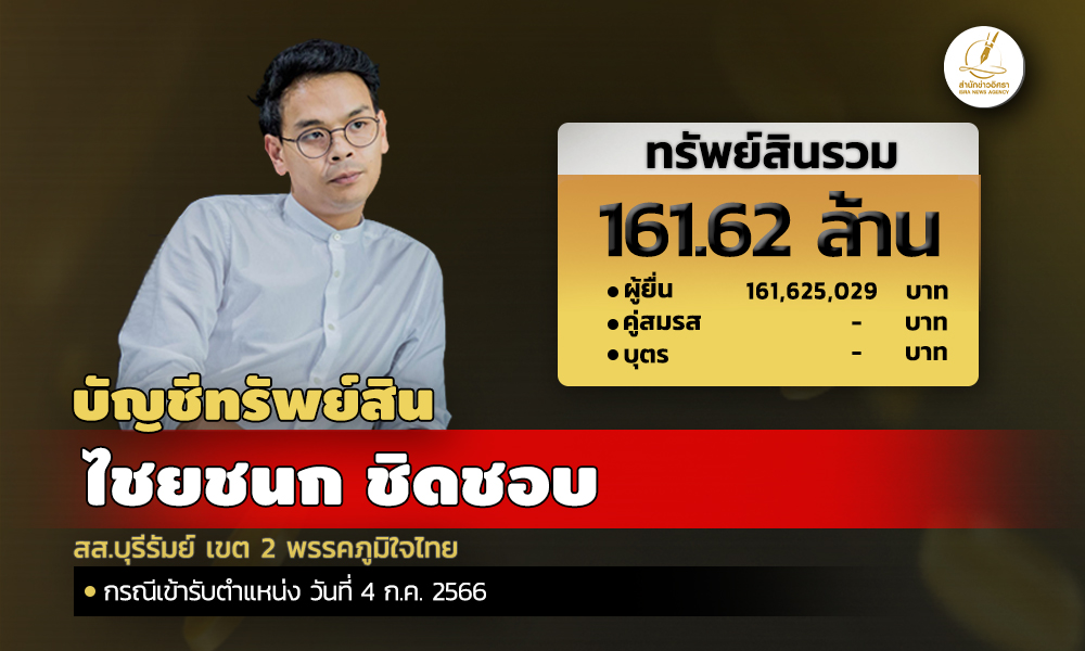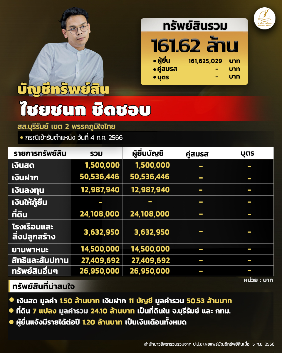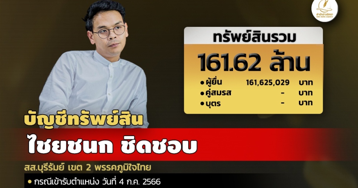 สำนักงานคณะกรรมการป้องกันและปราบปรามการทุจริตแห่งชาติ (ป.ป.ช.) เปิดเผยบัญชีแสดงทรัพย์สินและหนี้สินของ นายไชยชนก ชิดชอบ สส.บุรีรัมย์ เขต 2 พรรคภูมิใจไทย โดยแจ้งมี ทรัพย์สิน 161.62 ล. ประกอบด้วย เงินสด มูลค่า 1.50 ล. เงินฝาก 11 บัญชี มูลค่ารวม 50.53 ล. ที่ดิน 7 แปลง มูลค่ารวม 24.10 ล. เป็นที่ดินใน จ.บุรีรัมย์ และ กทม. ผู้ยื่นแจ้งมีรายได้ต่อปี 1.20 ล. เป็นเงินเดือนทั้งหมด