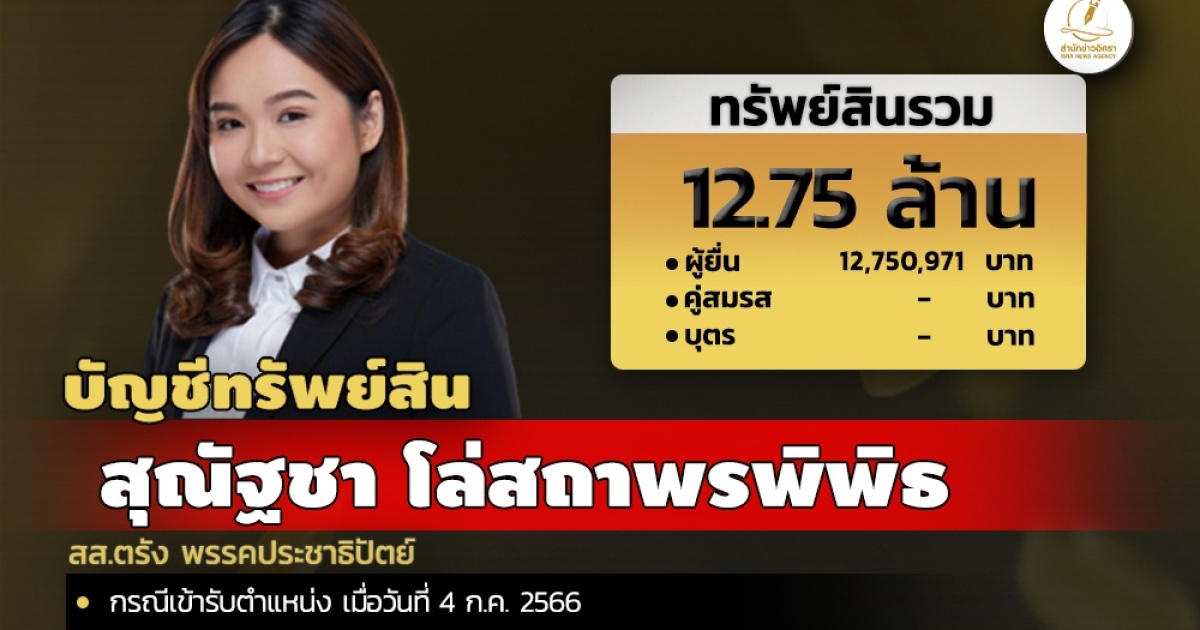 สำนักงานคณะกรรมการป้องกันและปราบปรามการทุจริตแห่งชาติ (ป.ป.ช.) เปิดเผยบัญชีแสดงทรัพย์สินและหนี้สินของ น.ส.สุณัฐชา โล่สถาพรพิพิธ สส.ตรัง พรรคประชาธิปัตย์ ทรัพย์สิน 12.75 ล. ประกอบด้วย เงินฝาก 3 บัญชี มูลค่ารวม 27,484 บาท โรงเรือนและสิ่งปลูกสร้าง 2 รายการ มูลค่ารวม 9.80 ล. ผู้ยื่นแจ้งมีรายได้ต่อปี 1.36 ล. จาก เงินเดือนประจำตำแหน่งและเงินเพิ่ม