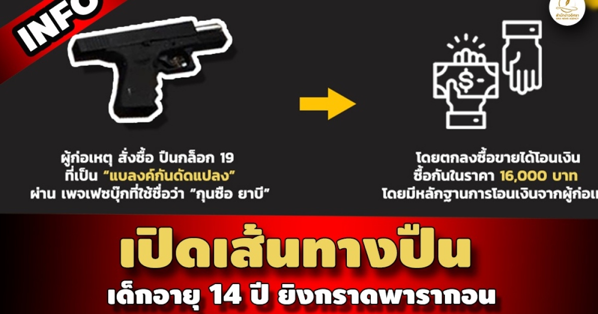 ตามรอยเส้นทางขายปืนทางออนไลน์ให้เด็ก 14 ปีกราดยิงในพารากอน พบเปิดเพจชื่อ “กุนซือ ยาบี” ขายปืนแบลงค์กันดัดแปลง ตำรวจได้หลักฐานการโอนเงินซื้อขายปืน ก่อนออกหมายจับแล้วเข้ารวบตัว สำนักข่าวอิศรา สรุปรายละเอียดสำคัญทั้งหมดมานำเสนอผ่านภาพอินโฟกราฟฟิก ดังนี้