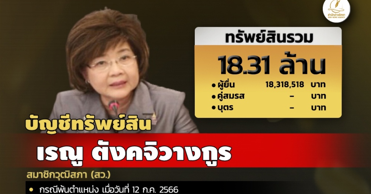 สำนักงานคณะกรรมการป้องกันและปราบปรามการทุจริตแห่งชาติ (ป.ป.ช.) เปิดเผยบัญชีแสดงทรัพย์สินและหนี้สินของ น.ส.เรณู ตังคจิวางกูร สมาชิกวุฒิสภา ทรัพย์สิน 18.31 ล. ประกอบด้วย เงินฝาก 15 บัญชี มูลค่ารวม 14 ล. ที่ดิน 2 แปลง มูลค่ารวม 2.14 แสนบาท โรงเรือนและสิ่งปลูกสร้าง 1 แปลง มูลค่ารวม 4.44 แสนบาท ผู้ยื่นแจ้งมีรายได้ต่อปี 1.50 ล. จาก เป็นเงินบำนาญ,เงินเดือน, เงินประจำตำแหน่ง,เบี้ยประชุม และค่าเช่าทรัพย์สิน