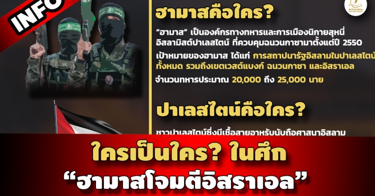 เช้าตรู่เวลาในท้องถิ่นของอิสราเอล 06.30 น.วันเสาร์ที่ 7 ต.ค.66 กองกำลังฮามาส ชาวปาเลสไตน์ ที่บริหารฉนวนกาซา โจมตีอิสราเอลแบบเซอร์ไพรซ์ครั้งใหญ่ที่สุดในรอบหลายปี สำนักข่าวอิศรา สรุปรายละเอียดสำคัญทั้งหมดมานำเสนอผ่านภาพอินโฟกราฟฟิก ดังนี้
