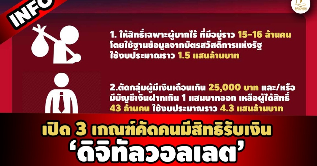 วันที่ 26 ตุลาคม 2566 คณะอนุกรรมการดิจิทัลวอลเลต เคาะ 3 เกณฑ์คัดคนรวยออก ไม่แจกดิจิทัลวอลเลต จ่อเสนอคณะกรรมการชุดใหญ่ที่มี ‘เศรษฐา’ เป็นประธานพิจารณาในสัปดาห์หน้า สำนักข่าวอิศรา สรุปรายละเอียดสำคัญทั้งหมดมานำเสนอผ่านภาพอินโฟกราฟฟิก ดังนี้