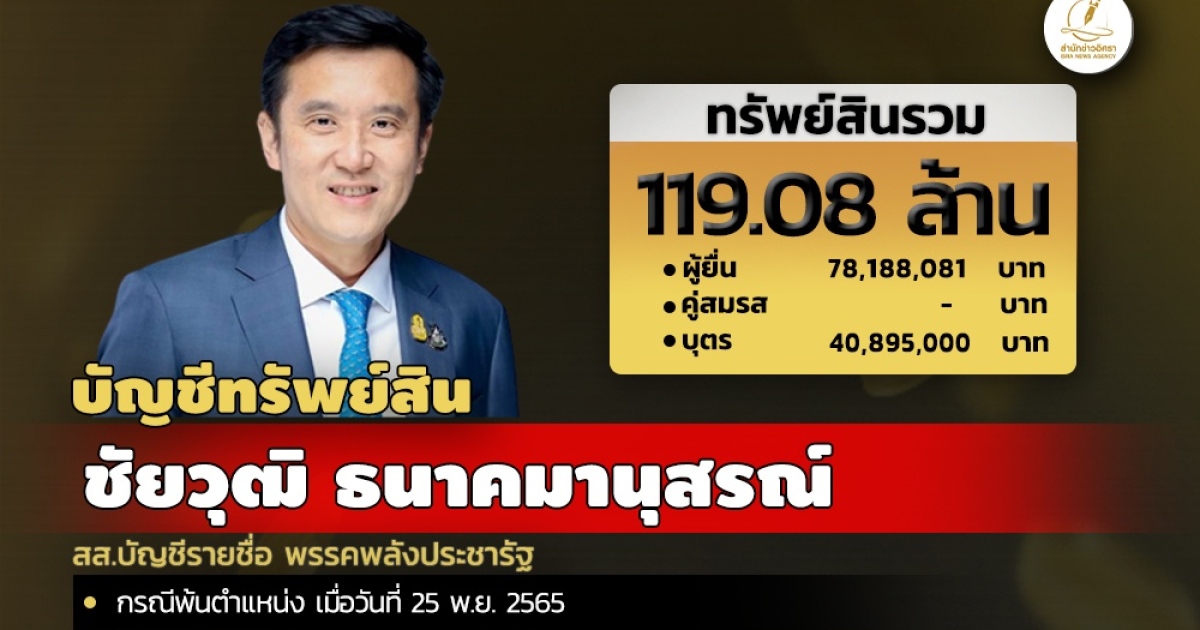 สำนักงานคณะกรรมการป้องกันและปราบปรามการทุจริตแห่งชาติ (ป.ป.ช.) เปิดเผยบัญชีแสดงทรัพย์สินและหนี้สินของ นาย ชัยวุฒิ ธนาคมานุสรณ์ สส.บัญชีรายชื่อ พรรคพลังประชารัฐ ทรัพย์สิน 119.08 ล. ประกอบด้วย เงินฝาก 7 บัญชี มูลค่ารวม 2.07 ล. ที่ดิน 11 แปลง เป็นที่ดินใน กรุงเทพฯ และอื่นๆ โรงเรือนและสิ่งปลูกสร้าง 5 หลัง มูลค่ารวม 43.58 ล. ทรัพย์สินอื่นๆ เช่น ทองคำแท่ง 96.5% มูลค่า 22.64 บาท นาฬิกา 3 เรือน