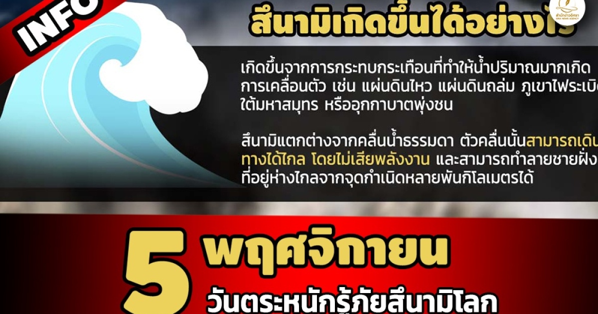 5 พฤศจิกายน สมัชชาใหญ่แห่งสหประชาชาติกำหนดเป็นวันตระหนักรู้สึนามิโลก มีที่มาจากเรื่องสั้นของญี่ปุ่นที่โด่งดังเรื่อง Inamura no Hi ของ ฮามากูจิ ที่จุดไฟเผาข้าวเปลือกที่เพิ่งเก็บเกี่ยวมาเพื่อเป็นดวงไฟสัญญาณเตือนให้ชาวบ้านคนอื่นๆ หนีขึ้นไปอยู่บนที่สูงจนรอดชีวิตจากสึนามิที่ถล่มหมู่บ้าน สำนักข่าวอิศรา จึงนำสาเหตุของสึนามิมานำเสนอ ผ่านภาพอินโฟกราฟฟิก ดังนี้