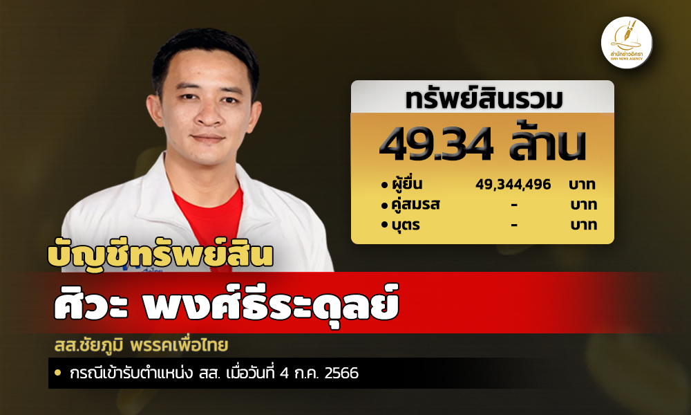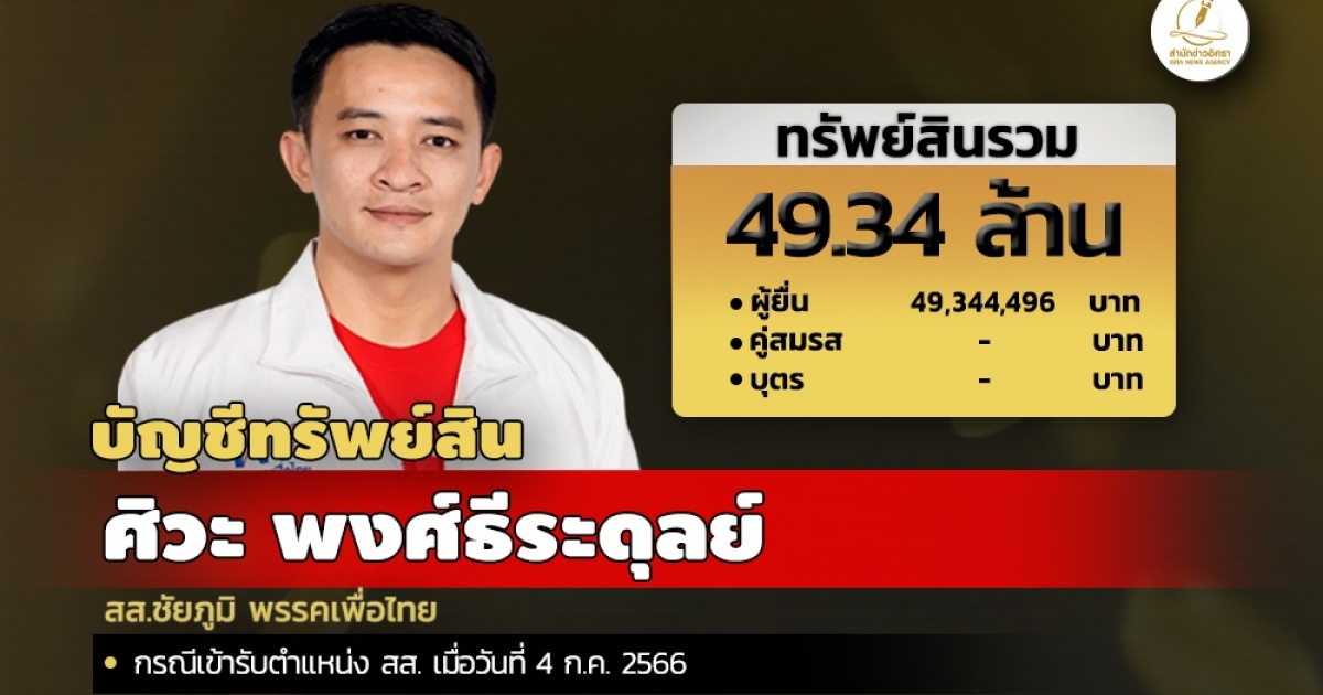 สำนักงานคณะกรรมการป้องกันและปราบปรามการทุจริตแห่งชาติ (ป.ป.ช.) เปิดเผยบัญชีแสดงทรัพย์สินและหนี้สินของ ศิวะ พงศ์ธีระดุลย์ สส.ชัยภูมิ พรรคเพื่อไทย ทรัพย์สิน 49.34 ล. ประกอบด้วย เงินฝาก 7 บัญชี มูลค่ารวม 154,496 บาท ที่ดิน 11 แปลง มูลค่ารวม 25 ล. โรงเรือนและสิ่งปลูกสร้าง 3 รายการ มูลค่ารวม 21 ล. ผู้ยื่นและคู่สมรส แจ้งมีรายได้ต่อปีรวม 1.68 ล. เป็น ค่าตอบแทน และค้าขาย