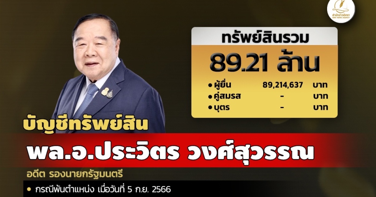 สำนักงานคณะกรรมการป้องกันและปราบปรามการทุจริตแห่งชาติ (ป.ป.ช.) เปิดเผยบัญชีแสดงทรัพย์สินและหนี้สินของ พล.อ.ประวิตร วงศ์สุวรรณ อดีต รองนายกรัฐมนตรี ทรัพย์สิน 89.21 ล. ประกอบด้วย เงินฝาก 9 บัญชี มูลค่ารวม 43.50 ล. ที่ดิน 3 แปลง มูลค่ารวม 4.87 ล. โรงเรือนและสิ่งปลูกสร้าง มูลค่า 10 ล. เป็นบ้าน 1 หลัง ทรัพย์สินอื่นๆ เช่น แหวน 9 วง นาฬิกา Tw Steel 1 เรือน มูลค่า 15,000 บาท ปืน 3 กระบอก