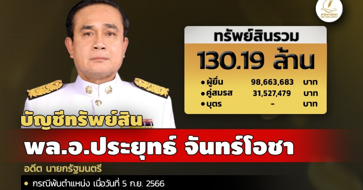 สำนักงานคณะกรรมการป้องกันและปราบปรามการทุจริตแห่งชาติ (ป.ป.ช.) เปิดเผยบัญชีแสดงทรัพย์สินและหนี้สินของ พล.อ.ประยุทธ์ จันทร์โอชา อดีต นายกรัฐมนตรี และรัฐมนตรีว่าการกระทรวงกลาโหม ทรัพย์สิน 130.19 ล. ประกอบด้วย เงินฝาก 12 บัญชี มูลค่ารวม 24.18 ล. ที่ดิน 5 แปลง มูลค่ารวม 9.14 ล. โรงเรือนและสิ่งปลูกสร้าง มูลค่า 3.6 ล. เป็นบ้าน 1 หลัง เจ้าของร่วมกับคู่สมรส ทรัพย์สินอื่นๆ เช่น แหวน - กำไลข้อมือ 10 วง นาฬิกา 9 เรือน สร้อยคอทองคำพร้อมพระ 6 เส้น ปืน 9 กระบอก จักรยาน 2 คัน และนาฬิกา 4 เรือน