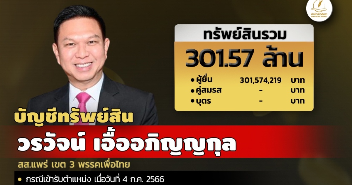 สำนักงานคณะกรรมการป้องกันและปราบปรามการทุจริตแห่งชาติ (ป.ป.ช.) เปิดเผยบัญชีแสดงทรัพย์สินและหนี้สินของ วรวัจน์ เอื้ออภิญญกุล สส.แพร่ เขต 3 พรรคเพื่อไทย ทรัพย์สิน 301.57 ล. ประกอบด้วย เงินสด มูลค่ารวม 301.57 ล. เงินฝาก 7 บัญชี มูลค่ารวม 853,559 บาท ที่ดิน 11 แปลง มูลค่ารวม 18.12 ล. ใน จ.แพร่ - นราธิวาส และแจ้งมีรายได้ต่อปีรวม 1.57 ล. จาก กองทุนเพื่อผู้เคยเป็น สส.และเงินเดือน สส. +เบี้ยประชุม โดยประมาณ