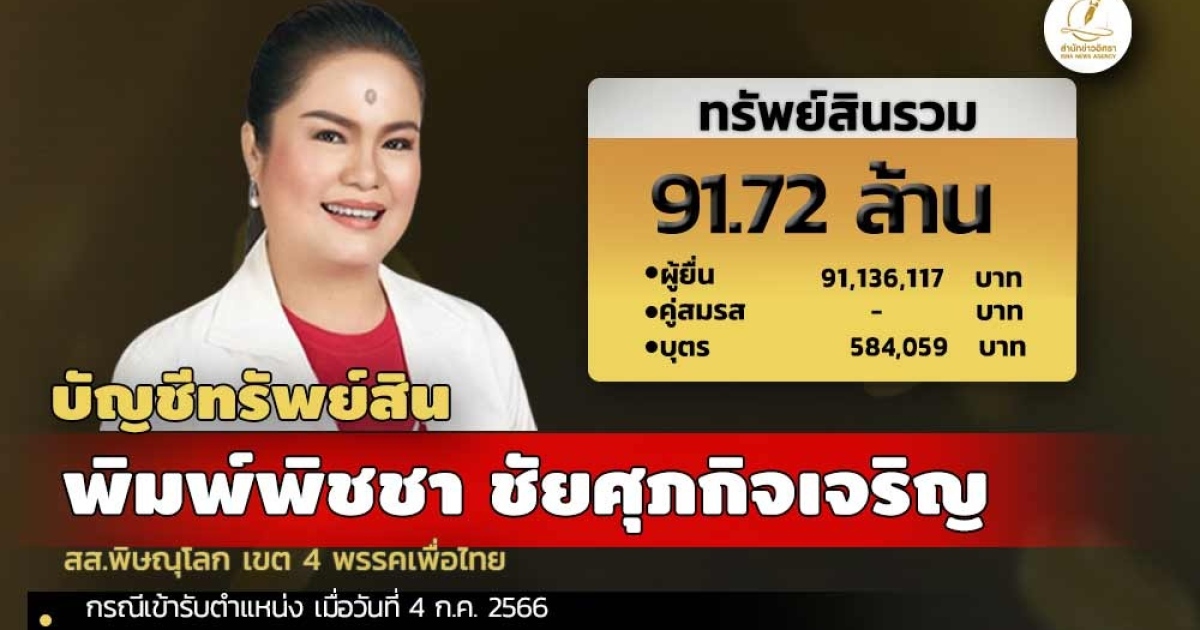 สำนักงานคณะกรรมการป้องกันและปราบปรามการทุจริตแห่งชาติ (ป.ป.ช.) เปิดเผยบัญชีแสดงทรัพย์สินและหนี้สินของ พิมพ์พิชชา ชัยศุภกิจเจริญ สส.พิษณุโลก เขต 4 พรรคเพื่อไทย ทรัพย์สิน 91.72 ล. ประกอบด้วย เงินสด มูลค่า 65,000 บาท เงินฝาก 53 บัญชี มูลค่ารวม 49.11 ล. ที่ดิน 8 แปลง มูลค่ารวม 6.53 ล. ใน จ.พิษณุโลก - ตาก - กำแพงเพชร ทรัพย์สินอื่นๆ เช่น อัญมณี และเครื่องประดับ 45 รายการ ทองคำ 21 รายการ ฃพระเครื่อง 15 องค์ นาฬิกา 7 เรือน และกระเป๋า 63 ใบ