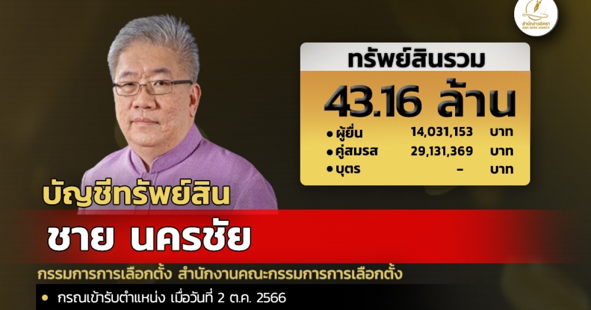 สำนักงานคณะกรรมการป้องกันและปราบปรามการทุจริตแห่งชาติ (ป.ป.ช.) เปิดเผยบัญชีแสดงทรัพย์สินและหนี้สินของ ชาย นครชัย กรรมการการเลือกตั้ง สำนักงานคณะกรรมการการเลือกตั้ง ทรัพย์สิน 43.16 ล. ประกอบด้วย ที่ดิน 6 แปลง มูลค่ารวม 3.86 ล. ที่ดิน 1 แปลง มูลค่า 10 ล. โรงเรือนและสิ่งปลูกสร้าง 2 รายการ มูลค่ารวม 15.47 ล.และยื่นแจ้งมีรายได้ต่อปี 3.04 ล. จาก เงินบำนาญ และเงินเดือน