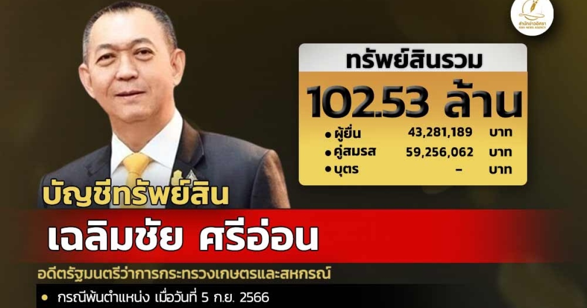 สำนักงานคณะกรรมการป้องกันและปราบปรามการทุจริตแห่งชาติ (ป.ป.ช.) เปิดเผยบัญชีแสดงทรัพย์สินและหนี้สินของ เฉลิมชัย ศรีอ่อน อดีตรัฐมนตรีว่าการกระทรวงเกษตรและสหกรณ์ ทรัพย์สิน 102.53 ล. ประกอบด้วย เงินฝาก 12 บัญชี มูลค่ารวม 9.93 ล. ที่ดิน 50 แปลง มูลค่า 74.60 ล. โรงเรือนและสิ่งปลูกสร้าง 1 รายการ มูลค่ารวม 2 ล. ผู้ยื่นและคู่สมรสแจ้งมีรายได้ต่อปีรวม 3.75 ล. จาก เดือนเงิน-ประจำตำแหน่ง เงินทุนเลี้ยงชีพ เบี้ยประชุม และค่าเช่าที่ดิน