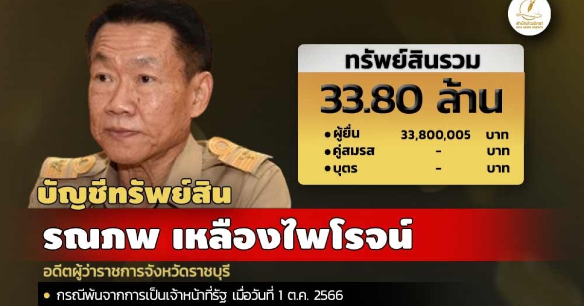 สำนักงานคณะกรรมการป้องกันและปราบปรามการทุจริตแห่งชาติ (ป.ป.ช.) เปิดเผยบัญชีแสดงทรัพย์สินและหนี้สินของ รณภพ เหลืองไพโรจน์ อดีตผู้ว่าราชการจังหวัดราชบุรี ทรัพย์สิน 33.80 ล. ประกอบด้วย เงินฝาก 7 บัญชี มูลค่ารวม 16.35 ล. ที่ดิน 2 แปลง มูลค่ารวม 1.50 ล. โรงเรือนและสิ่งปลูกสร้าง 1 รายการ มูลค่า 3 ล. เป็นห้องชุด/คอนโด 1 ห้อง และแจ้งมีรายได้ต่อปีรวม 1.40 ล. จาก เงินเดือน และเงินประจำตำแหน่ง