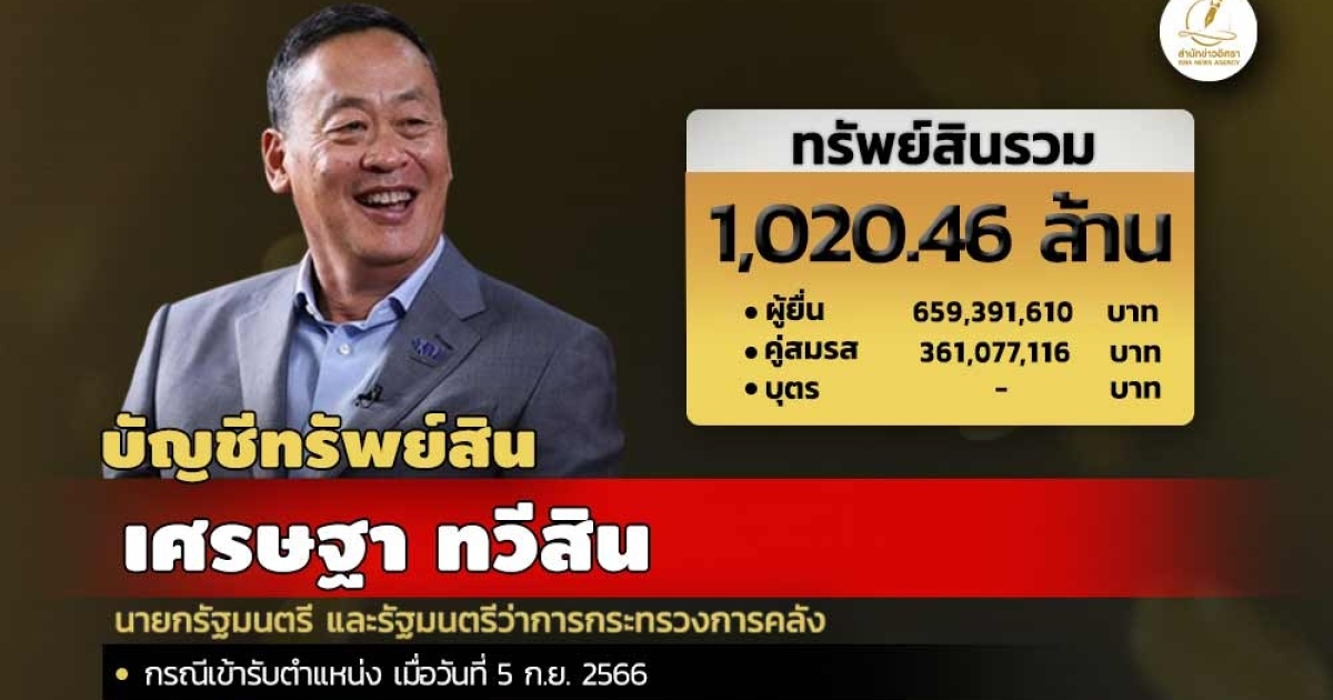 สำนักงานคณะกรรมการป้องกันและปราบปรามการทุจริตแห่งชาติ (ป.ป.ช.) เปิดเผยบัญชีแสดงทรัพย์สินและหนี้สินของ นายเศรษฐา ทวีสิน นายกรัฐมนตรี และรัฐมนตรีว่าการกระทรวงการคลัง ทรัพย์สิน 1,020.46 ล. ประกอบด้วย เงินสด มูลค่ารวม 2.80 ล. เงินฝาก 85 บัญชี มูลค่ารวม 116 ล. ที่ดิน 1 แปลง มูลค่า 158.40 แสนบาท ในเขตพระโขนง กรุงเทพฯ ทรัพย์สินอื่นๆ เช่น พระเครื่อง-ตะกรุด 6 องค์ นาฬิกา 69 เรือน กำไลตะปูฝังเพชร 31 ชุด หีบหลุยส์วิตตองXสุพรีม ชุดสร้อยเพชร, ไข่มุก, กำไลตะปูฝังเพชร 31 ชุด