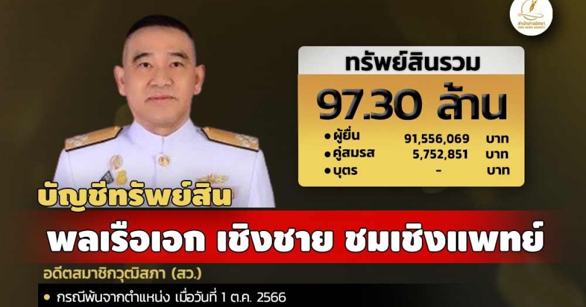 สำนักงานคณะกรรมการป้องกันและปราบปรามการทุจริตแห่งชาติ (ป.ป.ช.) เปิดเผยบัญชีแสดงทรัพย์สินและหนี้สินของ พลเรือเอก เชิงชาย ชมเชิงแพทย์ ผู้ว่าการธนาคารแห่งประเทศไทย ทรัพย์สิน 97.30 ล. ประกอบด้วย เงินสด มูลค่า 2 ล. เงินฝาก 27 บัญชี มูลค่ารวม 8.65 ล.ที่ดิน 17 แปลง มูลค่า 27.86 ล. เป็นที่ดิน จังหวัดระยอง,ชลบุรี และอื่นๆ ทรัพย์สินอื่นๆ เช่น ปืนพก 3 กระบอก พระสมเด็จกรอบทอง 2 องค์ นาฬิกาแบรนด์เนม 3 เรือน เป็นต้น