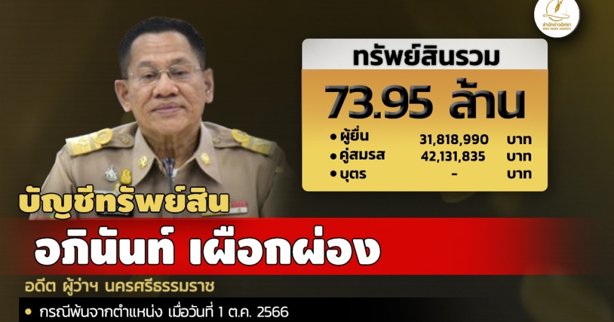 สำนักงานคณะกรรมการป้องกันและปราบปรามการทุจริตแห่งชาติ (ป.ป.ช.) เปิดเผยบัญชีแสดงทรัพย์สินและหนี้สินของ อภินันท์ เผือกผ่อง อดีต ผู้ว่าราชการจังหวัดนครศรีธรรมราช ทรัพย์สิน 73.95 ล. ประกอบด้วย เงินฝาก 14 บัญชี มูลค่ารวม 481,275 บาท ที่ดิน 25 แปลง มูลค่า 19.86 ล. โรงเรือนและสิ่งปลูกสร้าง 17 แปลง มูลค่ารวม 37.65 ล. ทรัพย์สินอื่นๆ นาฬิกา 6 เรือน อาวุธปืน 2 กระบอก พระเครื่อง 25 องค์ เป็นต้น