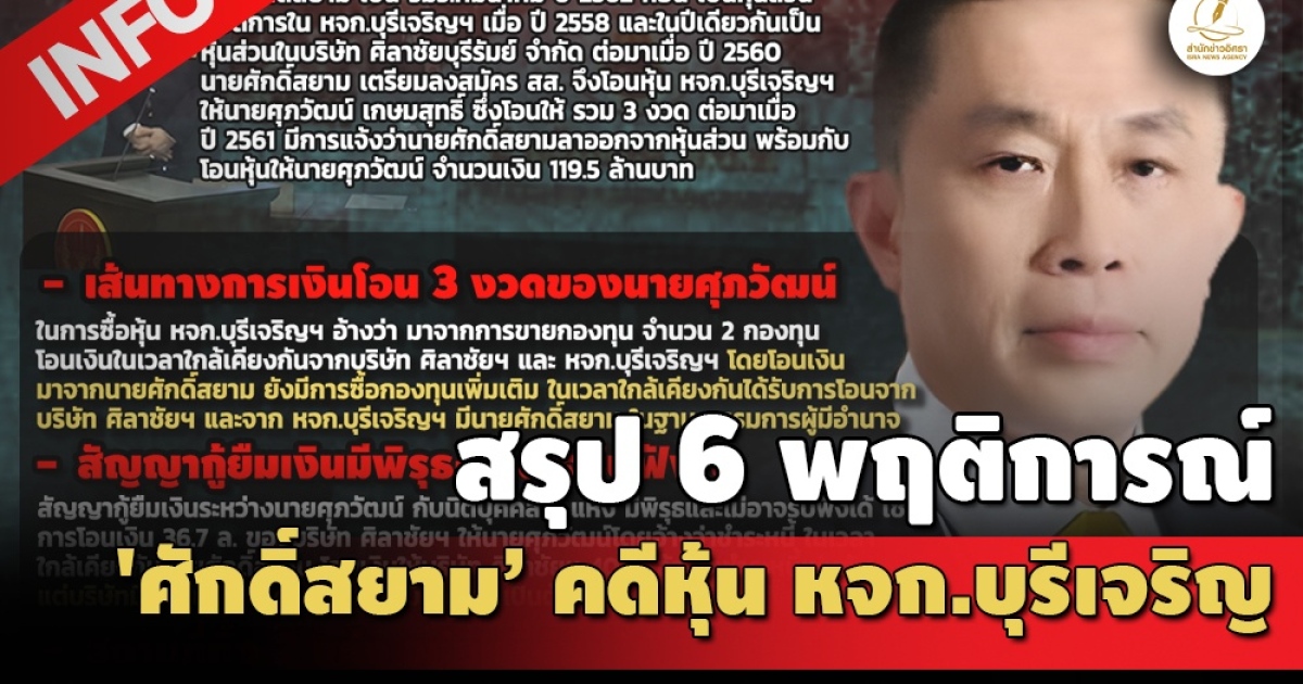 เมื่อวันที่ 17 ม.ค.2567 ศาลรัฐธรรมนูญมีคำวินิจฉัยในคดีที่ สมาชิกสภาผู้แทนราษฎร (สส.) จำนวน 54 คน ยื่นคำร้องต่อประธานสภาผู้แทนราษฎร (ผู้ร้อง) เมื่อวันที่ 25 ม.ค. 2566 ว่า นายศักดิ์สยาม ชิดชอบ รัฐมนตรีว่าการกระทรวง (รมว.) คมนาคม (ผู้ถูกร้อง) ยังคงไว้ซึ่งหุ้นส่วนและยังคงเป็นผู้ถือหุ้นและเจ้าของห้างหุ้นส่วนจำกัดบุรีเจริญคอนสตรัคชั่นอย่างแท้จริง ทำให้ความเป็นรัฐมนตรีสิ้นสุดลงนับตั้งแต่วันที่ 3 มี.ค.2566 ซึ่งเป็นวันที่ศาลรัฐธรรมนูญได้สั่งให้นายศักดิ์สยามหยุดปฏิบัติหน้าที่ เนื่องจากกระทำต้องห้ามตามรัฐธรรมนูญ ม.187 ประกอบพ.ร.บ.การจัดการหุ้นส่วนและหุ้นของรัฐมนตรี พ.ศ. 2543 ม.4 (1) เป็นเหตุให้ความเป็นรัฐมนตรีของผู้ถูกร้องสิ้นสุดลง เฉพาะตัวตามรัฐธรรมนูญ ม.170 วรรคหนึ่ง (5) สำนักข่าวอิศรา สรุป 6 พฤติการณ์ นายศักดิ์สยาม ชิดชอบ มานำเสนอผ่านภาพอินโฟกราฟฟิก ดังนี้