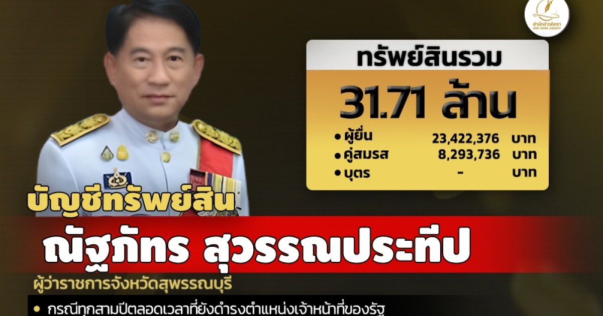 สำนักงานคณะกรรมการป้องกันและปราบปรามการทุจริตแห่งชาติ (ป.ป.ช.) เปิดเผยบัญชีแสดงทรัพย์สินและหนี้สินของ ณัฐภัทร สุวรรณประทีป ผู้ว่าราชการจังหวัดสุพรรณบุรี ทรัพย์สิน 31.71 ล. ประกอบด้วย เงินฝาก 19 บัญชี มูลค่ารวม 18.75 ล. ที่ดิน 4 แปลง มูลค่ารวม 4.27 ล. โรงเรือนและสิ่งปลูกสร้าง มูลค่ารวม 3.75 ล. จำนวน 5 หลัง ทรัพย์สินอื่น 536,000 บาท เป็นสร้อยทองคำ พระเลี่ยมทอง แหวน จี้ และเข้มกลัดสภาการชาดไทย
