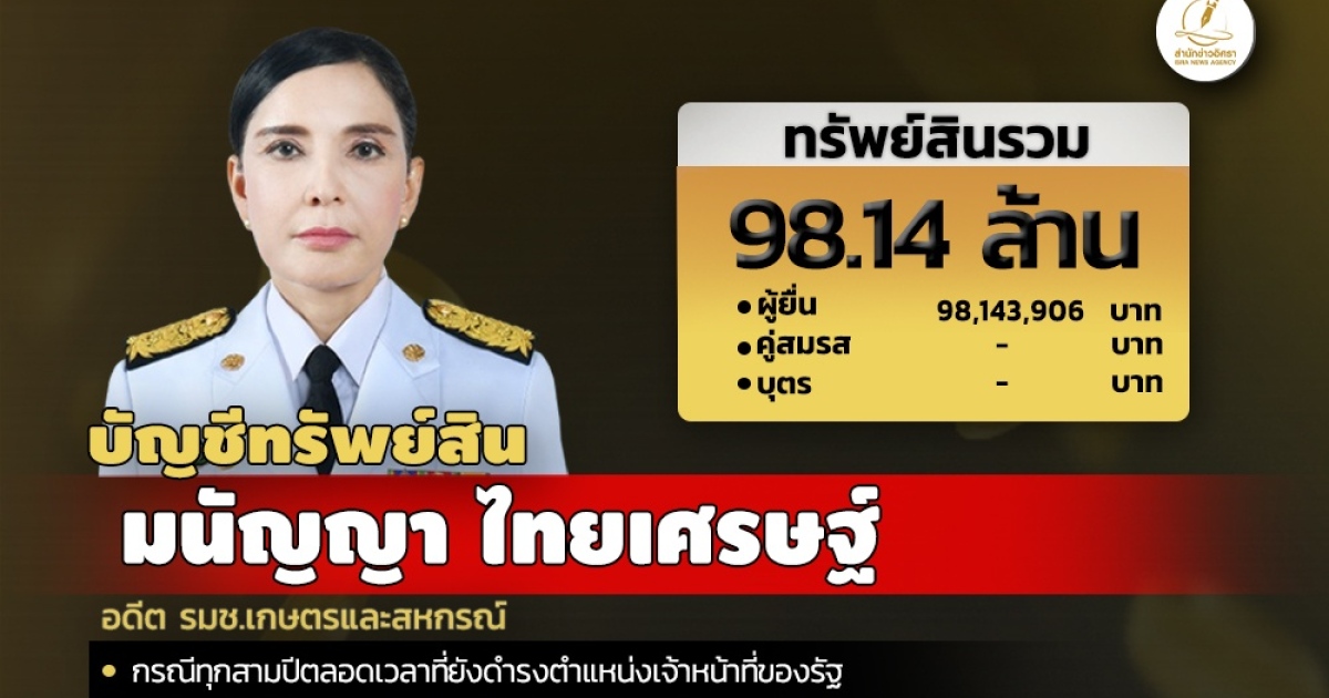 สำนักงานคณะกรรมการป้องกันและปราบปรามการทุจริตแห่งชาติ (ป.ป.ช.) เปิดเผยบัญชีแสดงทรัพย์สินและหนี้สินของ มนัญญา ไทยเศรษฐ์ อดีต รมช.เกษตรและสหกรณ์ ทรัพย์สิน 98.14 ล. ประกอบด้วย เงินสด มูลค่า 18 ล. เงินฝาก 4 บัญชี มูลค่ารวม 5.25 ล. ที่ดิน 25 แปลง มูลค่ารวม 36.08 ล. ส่วนใหญ่ใน จ.อุทัยธานี, ชลบุรี และนนทบุรี ทรัพย์สินอื่นๆ เช่น ทองคำแท่ง 15 แท่ง แท่งละ 10 บาท หนักรวม 150 บาท เครื่องเพชร 5 ชิ้น สร้อยคอ,นาฬิกา 2 ชิ้น และนาฬิกา,แหวนเพชร 2 ชิ้น