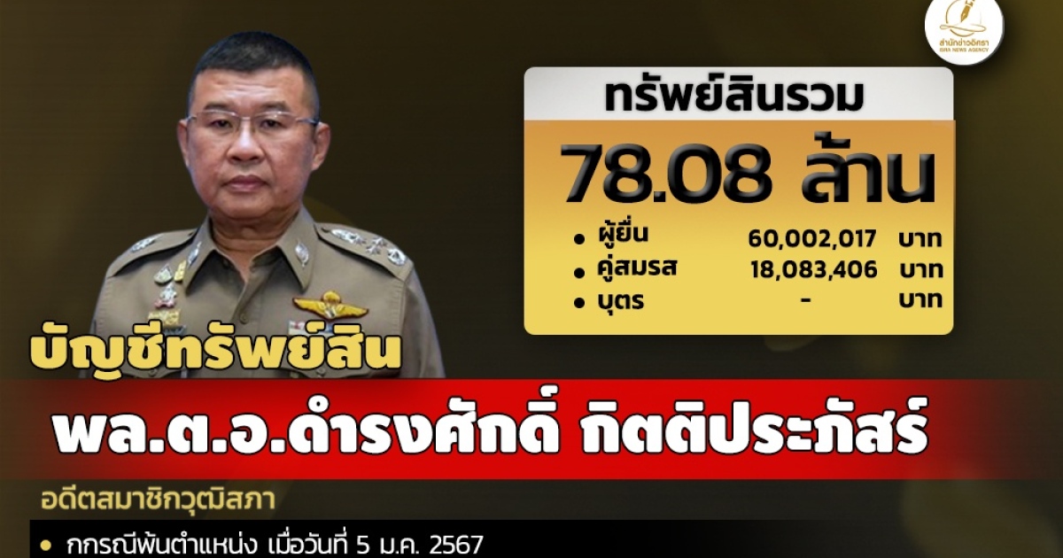 สำนักงานคณะกรรมการป้องกันและปราบปรามการทุจริตแห่งชาติ (ป.ป.ช.) เปิดเผยบัญชีแสดงทรัพย์สินและหนี้สินของ พล.ต.อ.ดำรงศักดิ์ กิตติประภัสร์ อดีต สมาชิกวุฒิสภา ทรัพย์สิน 78.08 ล. ประกอบด้วย เงินฝาก 23 บัญชี มูลค่ารวม 4.40 ล. ที่ดิน 7 แปลง มูลค่ารวม 27.11 ล. โรงเรือนและสิ่งปลูกสร้าง 1 หลัง มูลค่ารวม 12.77 ล. ทรัพย์สินอื่นๆ เช่น ปืน 6 กระบอก สร้อยคอทองคำ 3 รายการ นาฬิกาแบรนด์เนม 3 รายการ กระเป๋าถือ Chanel สีดำ , Dior เป็นต้น